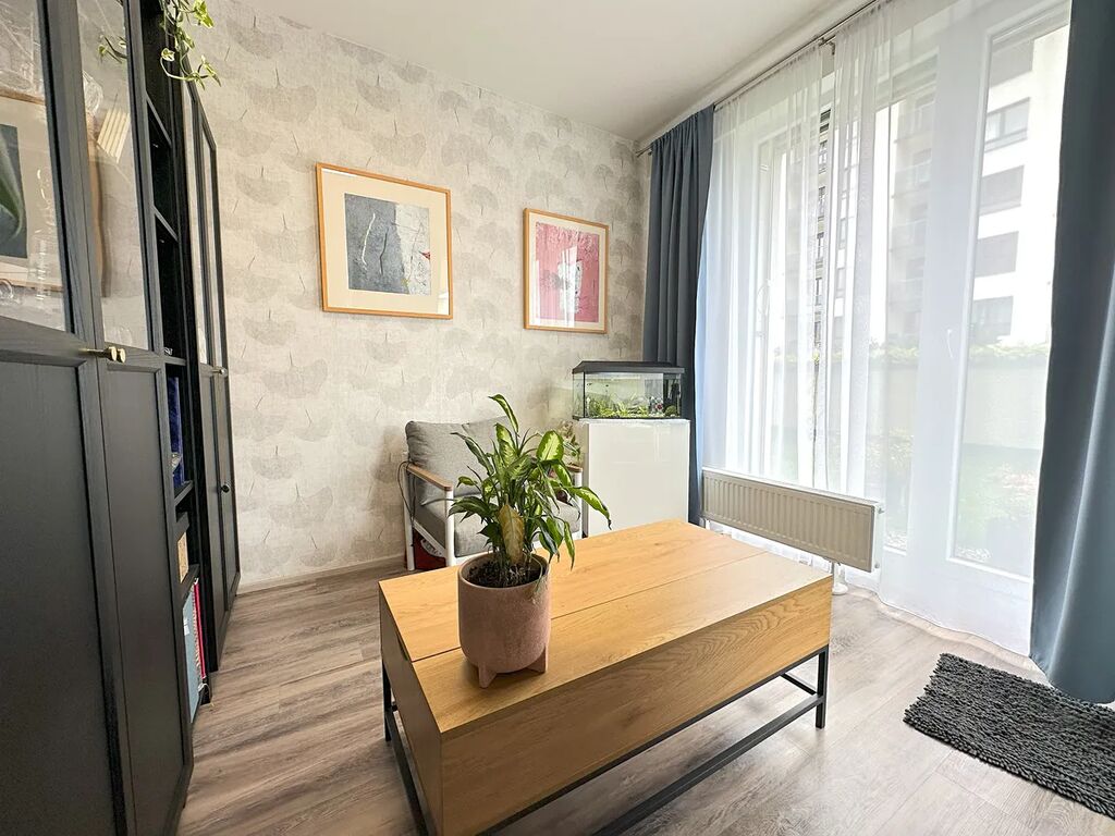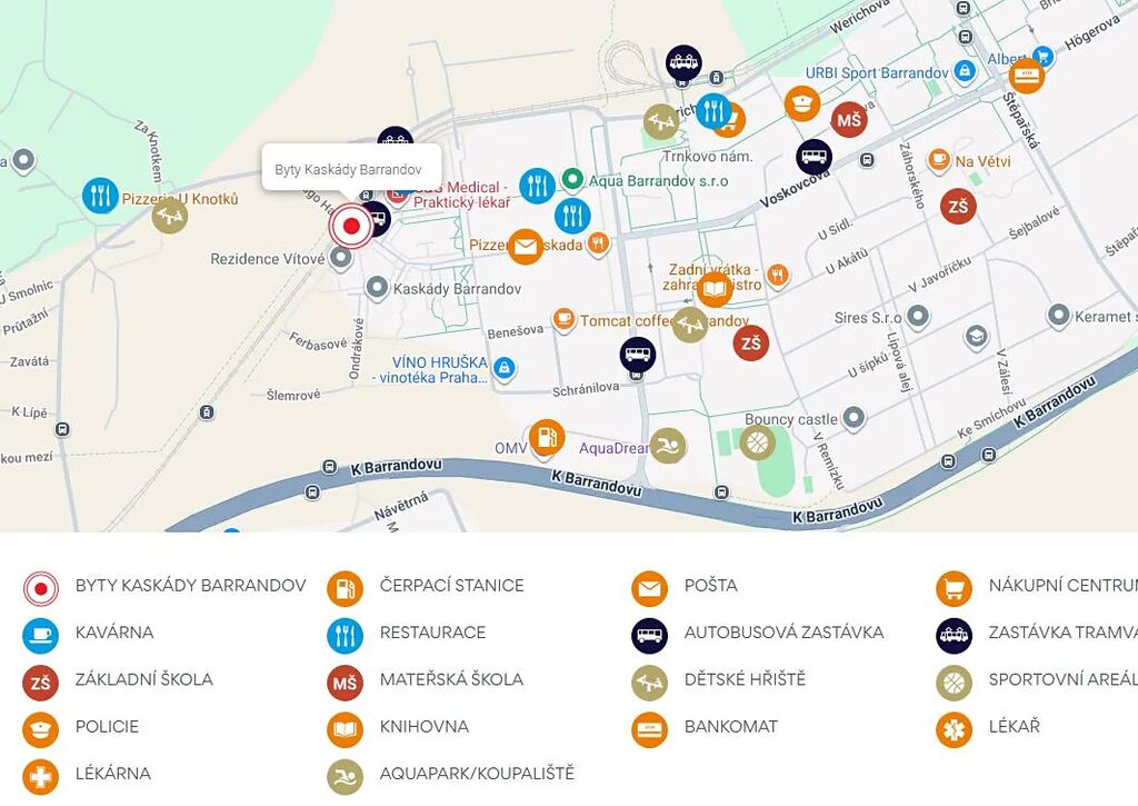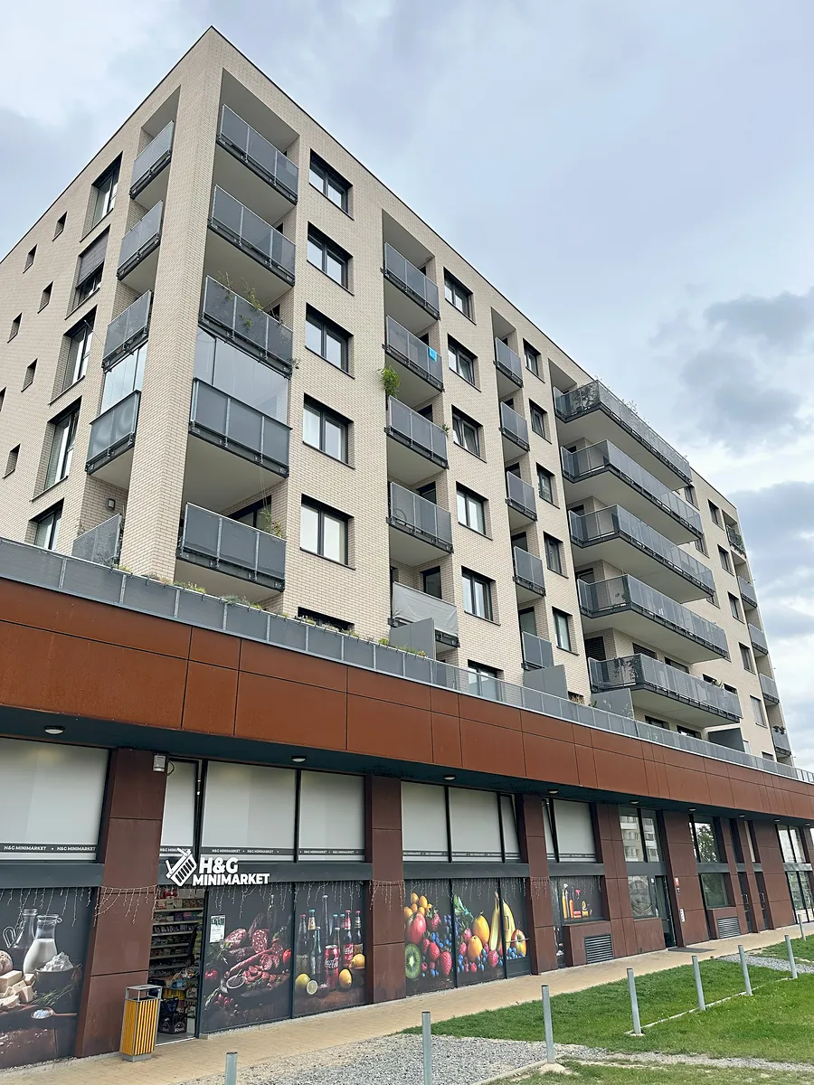Byt se nachází v 1. podlaží (tj. v bezpečné výši nad terénem – orientace na západ do klidného neprůchozího vnitrobloku s parkovou úpravou a bez provozu aut) moderního klidného a kvalitně postaveného domu (projekt Kaskády Barrandov, developer FINEP, kolaudace 2023) na nově zbudovaném náměstí.