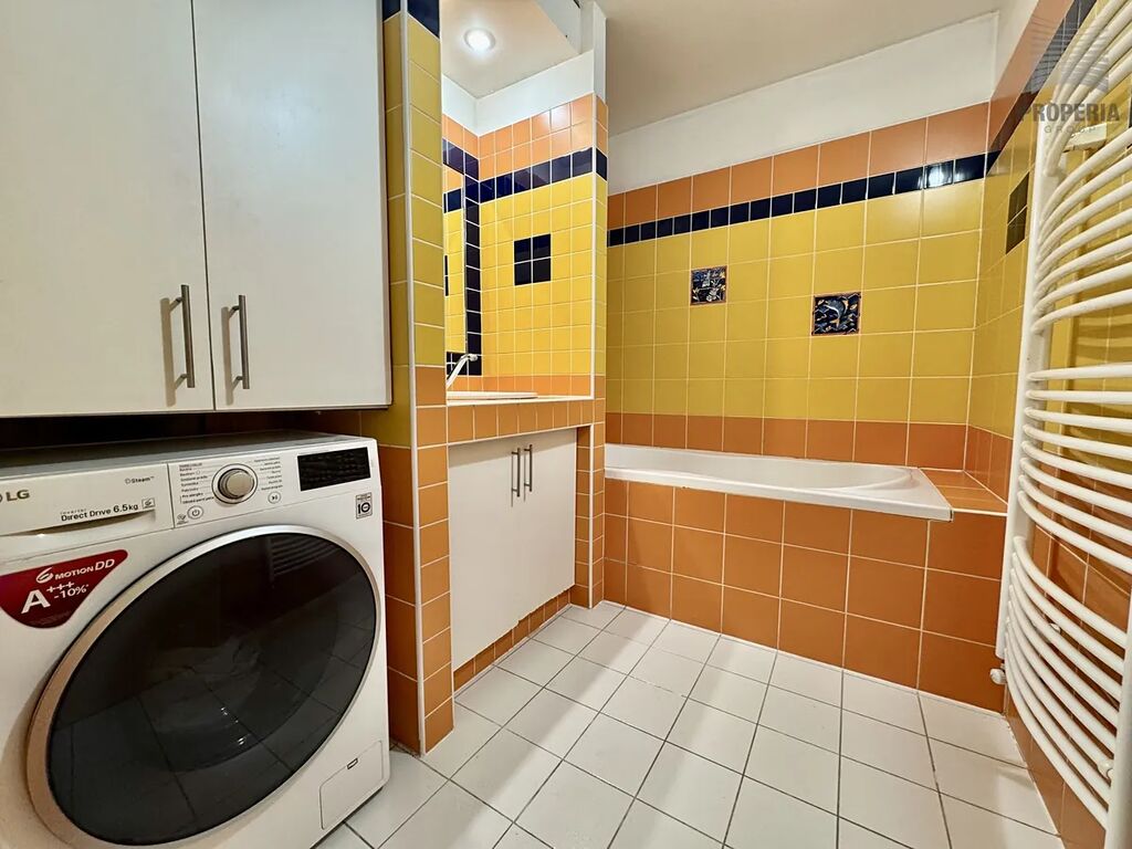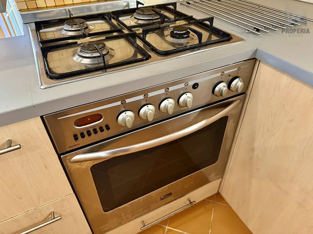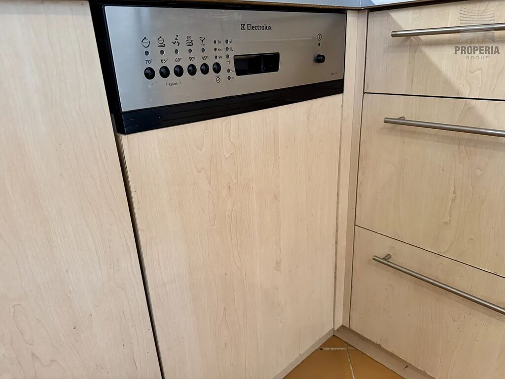 Velkorysý obývací pokoj s kuchyňským koutem (západ) je orientovan do vnitřního bloku se zahradou a je vybaven jídelní nábytkovou sestavou, sedací soupravou, ledničkou s mrazničkou, myčkou nádobí a kombinovaným sporákem s plynovou varnou deskou. V koupelně s vanou je k dispozici automatická pračka. Toaleta je samostatná. Obě ložnice jsou orientovány východním směrem do klidné ulice a jedna z nich má prostornou šatnu.