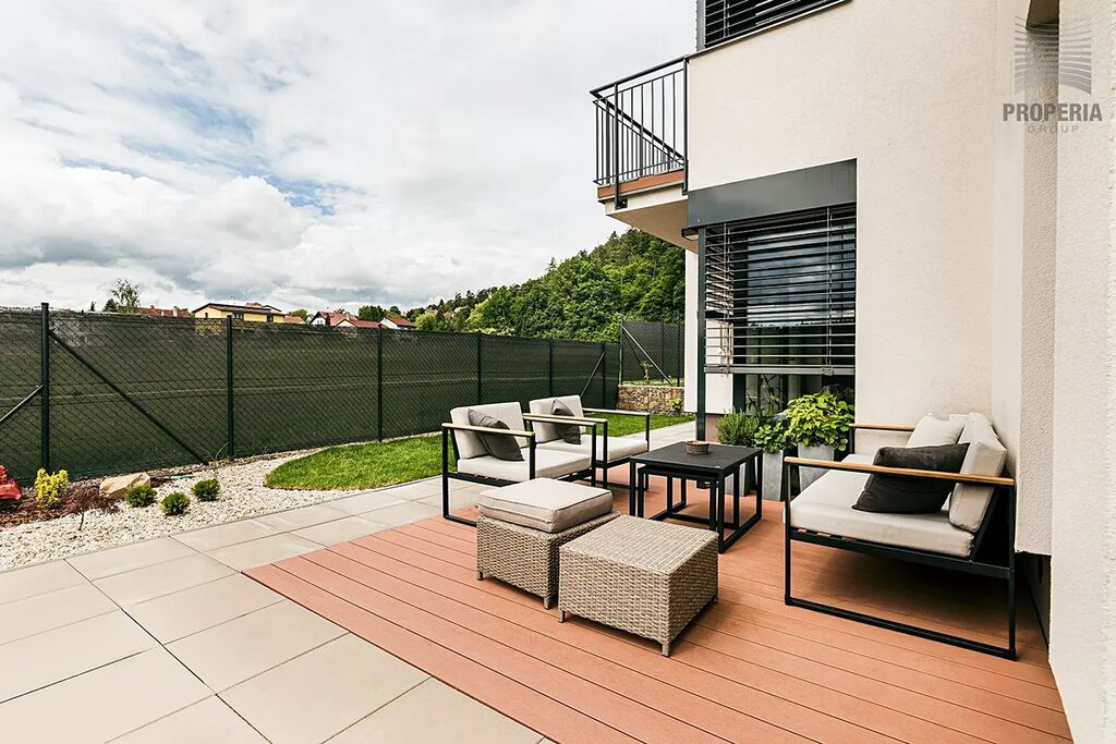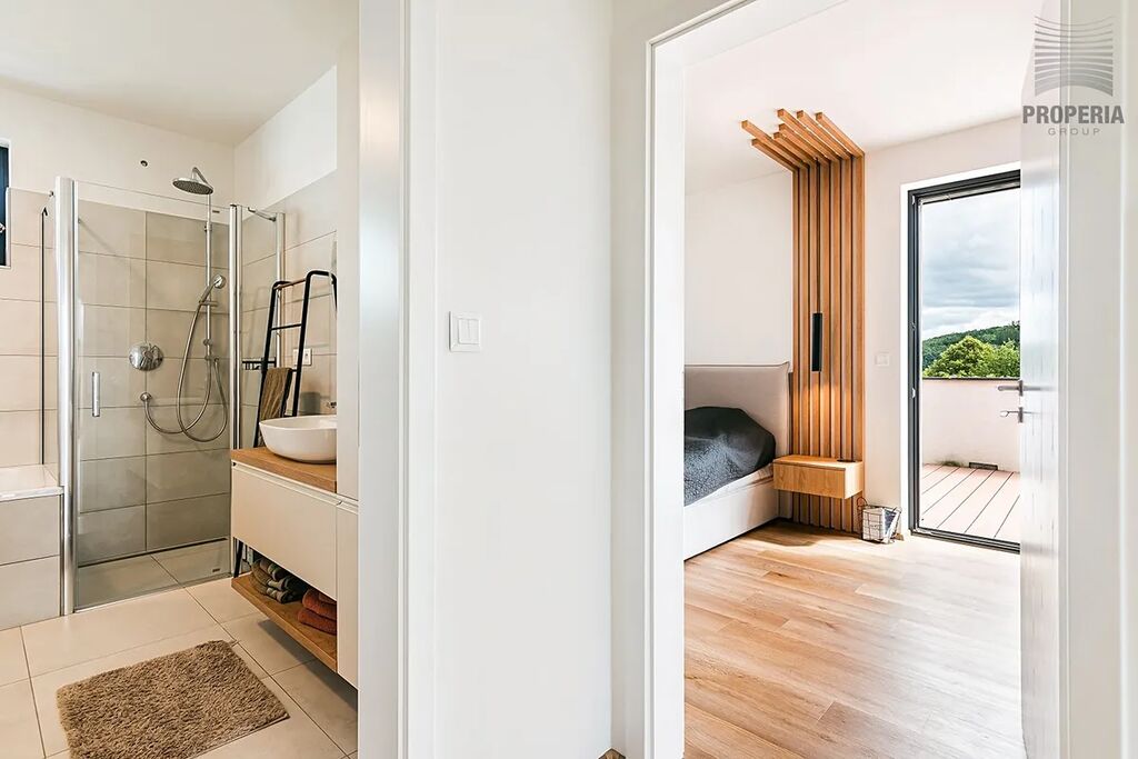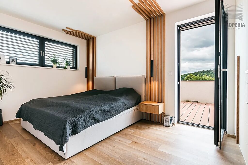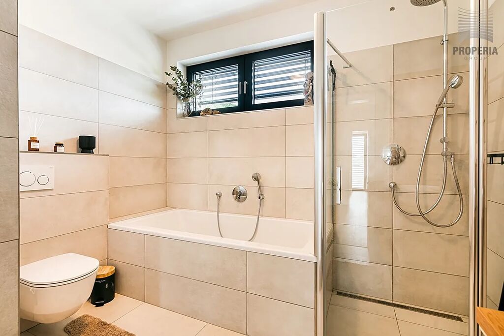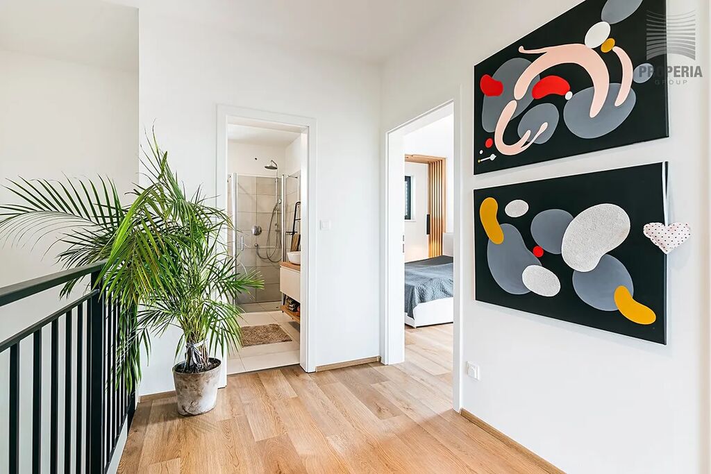 Celý dům je prosycen světlem, designové pojetí celého domu je znát na každém detailu, koupelnu a 2 wc nevyjímaje. Ze všech pokojů v patře vstoupíte na prostornou terasu s panoramatickým výhledem do okolí.