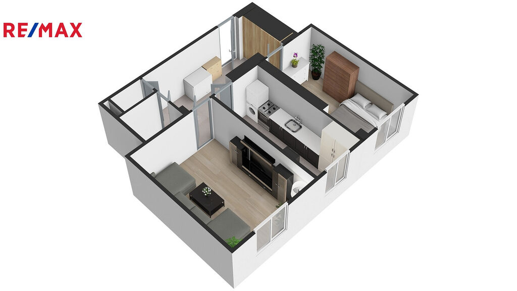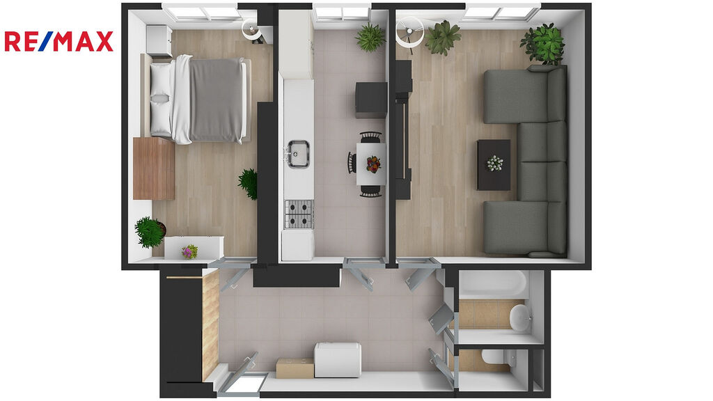 Byt sestává ze dvou neprůchozích pokojů, které poskytují dostatek soukromí, kuchyně, chodby, koupelny s vanou a WC.