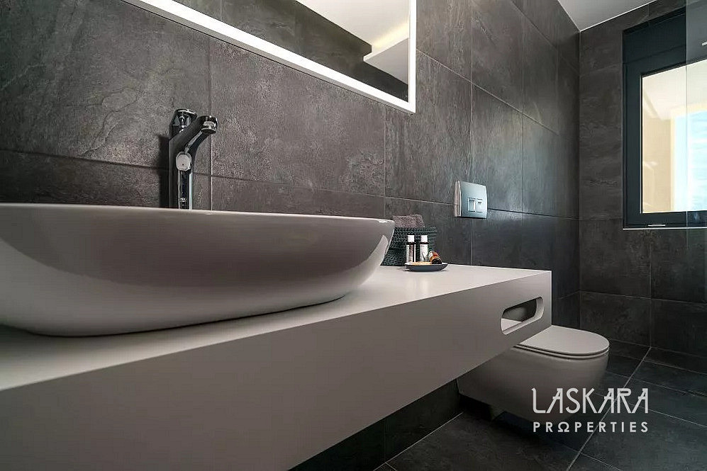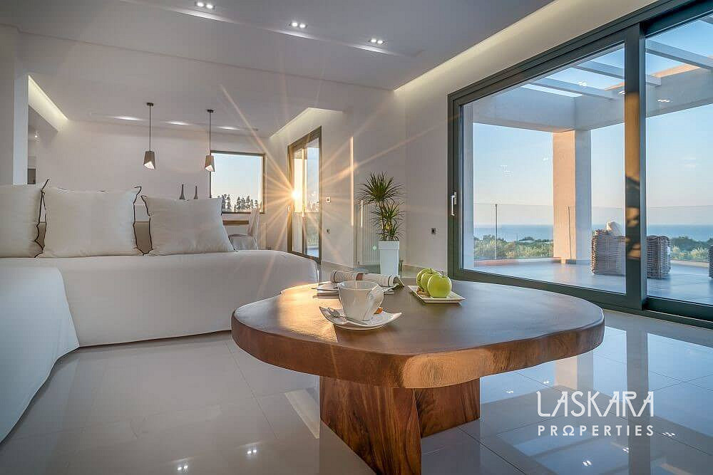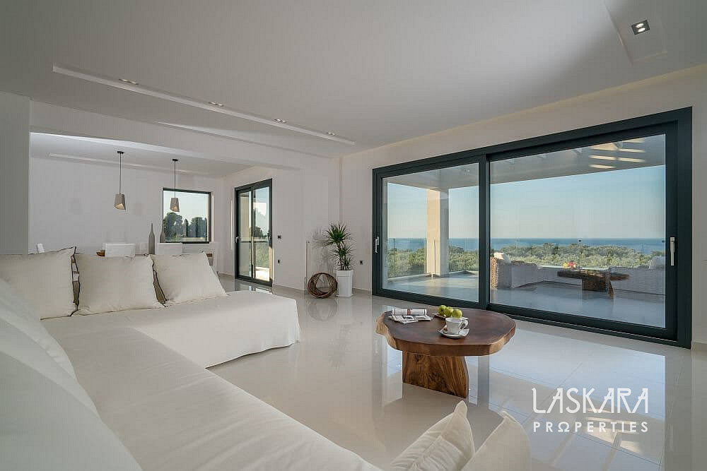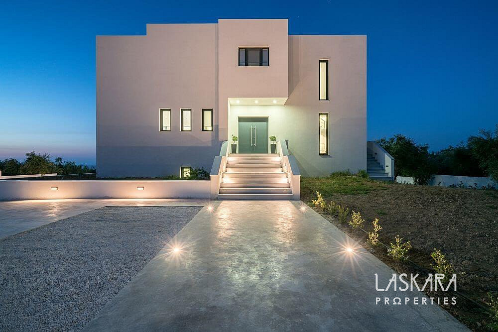 Tato nadčasová vila o rozloze 370 m² je rozdělena do tří podlaží a navržena tak, aby nabízela maximální pohodlí až pro 12 hostů. Otevřené prosklené plochy vpouštějí dovnitř moře světla a přetvářejí interiér v živé plátno, na němž se střídají odstíny bílého interiéru se zelení olivových hájů a modří moře.
