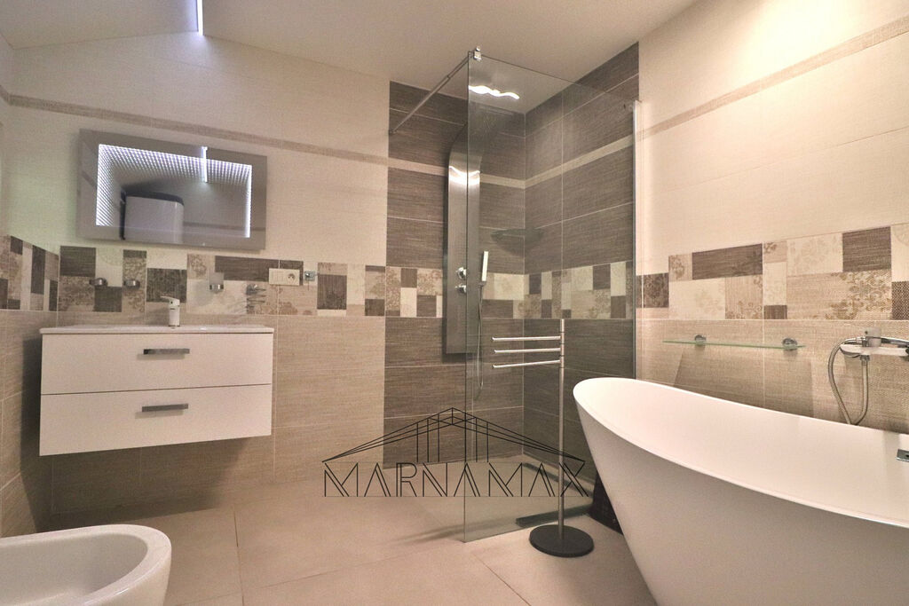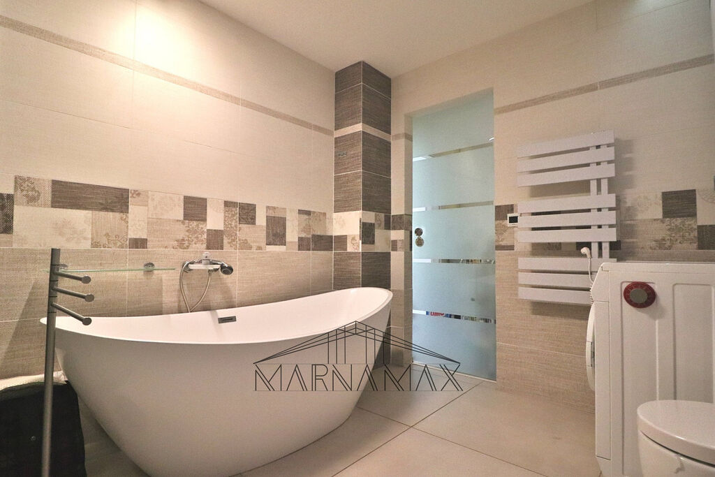 Samostatné WC se nachází na chodbě. Komfort zajišťuje elektrické podlahové vytápění, možnost vytápění krbem a termočlánek na fasádě, který pomáhá udržet teplo i v chladnějších dnech.