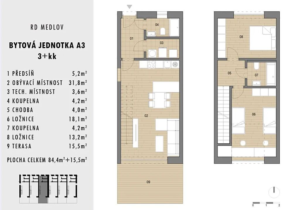 Nabízíme energeticky úsporný byt 3+kk o podlahové ploše 84,4m2 s terasou a zahrádkou v nově vznikajícím projektu Rodinné domy Medlov u Brna. Projekt je zasazen do klidné lokality v sousedství rodinných domů s výbornou dostupností Brna, zastávka autobusu je 20m od domu. Termín dokončení je plánován na říjen 2026.