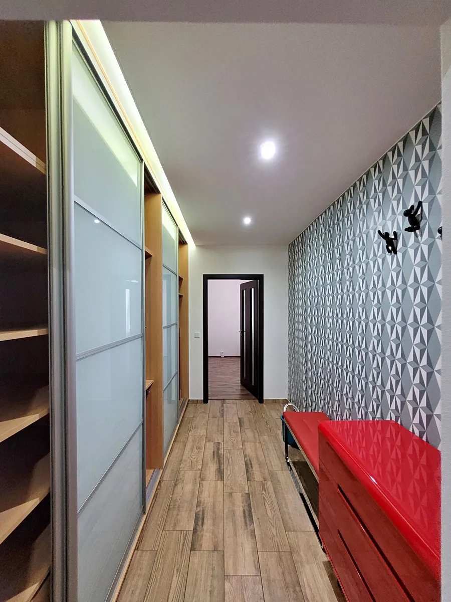 Dlouhá vstupní chodba pak disponuje velkou vestavěnou šatní skříní s množstvím úložného prostoru a botníkem pro organizaci obuvi a dalších potřeb.