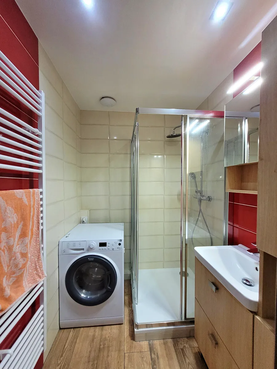 Koupelna je prakticky zařízená sprchovým koutem a kombinovanou pračkou se sušičkou, což usnadňuje každodenní péči o prádlo. WC je samostatně.