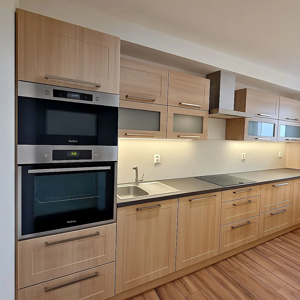 Byt je ideálně navržený pro komfortní bydlení, kde kuchyň na míru zaujme vestavěnými spotřebiči včetně elektrické trouby, mikrovlnné trouby, myčky nádobí, sklokeramické varné desky, digestoře, lednice s mrazákem a zásobníkem na vodu, doplněné o jídelní stůl s designovými židlemi pro pohodlné stolování.