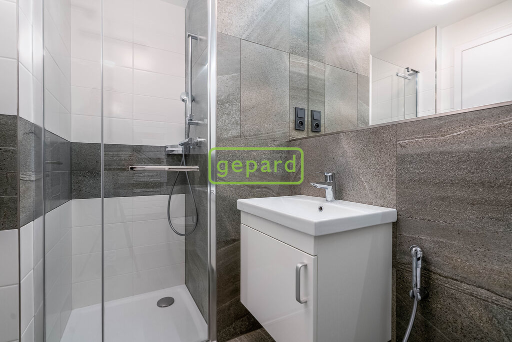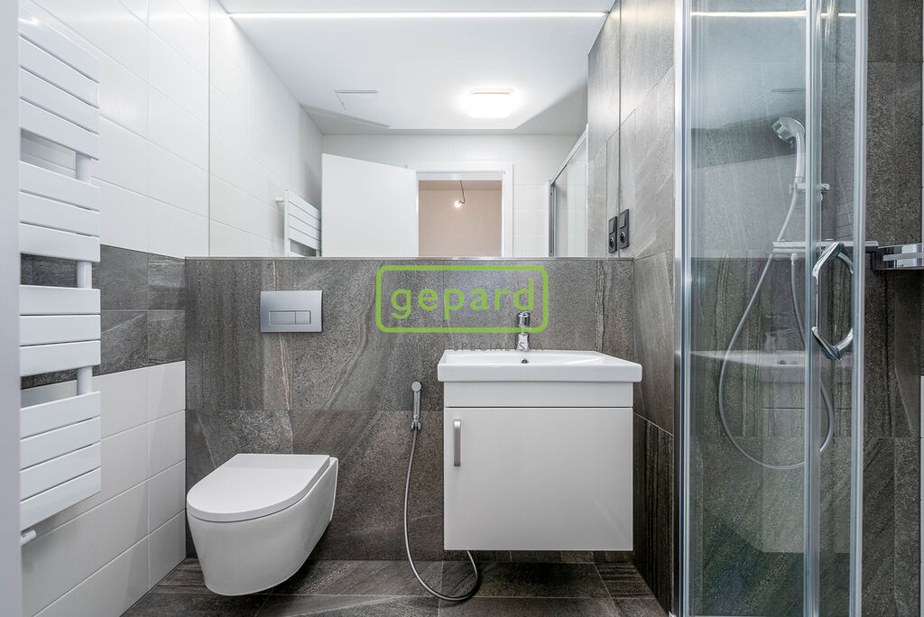 Z předsíně vpravo, je také vstup do prostorné koupelny se sprchou a WC. Podlaha - Vinylové velkoformátové vlysy a dlažba. Byt má instalovanou kuchyňskou linku. K vybavení dále patří designové osvětlení, předokenní žaluzie.