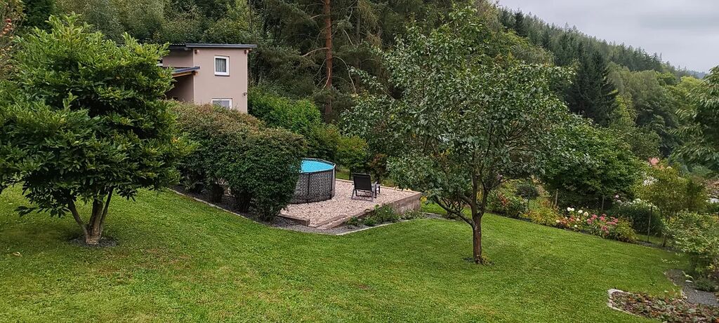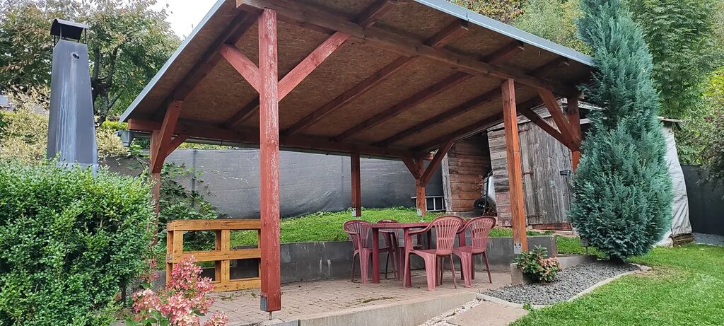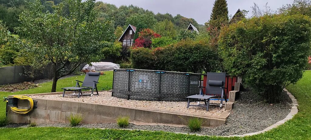 Rekreační objekt se nachází v zahrádkářské kolonii, najdete zde klid a soukromí. Pozemek je mírně svažitý a slunný, nechybí zde dřevěná pergola s grilem, skleník, nadzemní bazén, kůlna na nářadí, dokonce zde najdete i pískoviště pro děti.