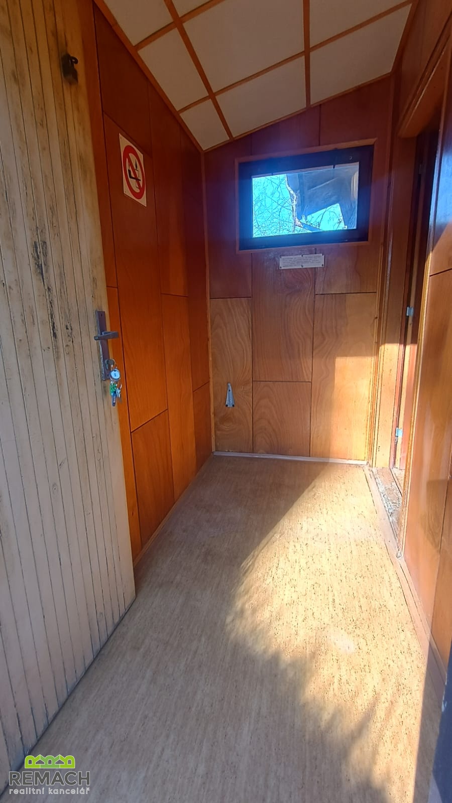 o celkové podlahové ploše 53 m2. Chata se nachází na klidném a malebném místě, ideálním pro odpočinek. Prostorný interiér je vhodný pro pohodlné bydlení dvou osob. V kuchyni najdete dvou plotýnkový plynový vařič a vestavěnou lednici. Objekt je napojen na elektřinu a vodu. Vytápět lze pomocí krbových kamen nebo přímotopu.