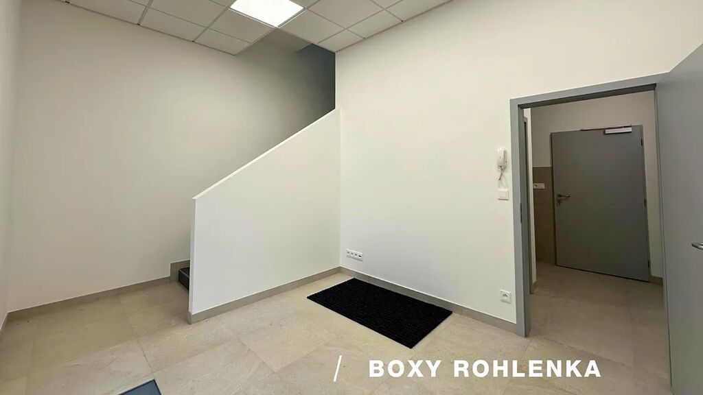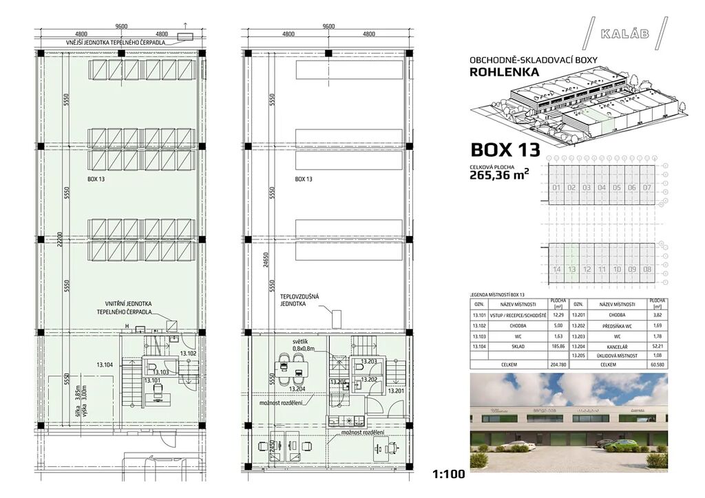 Box je dvoupodlažní v přední části, kde se v přízemí nachází prostor se sociálním zázemím o výměře 16 m² pro recepci, showroom nebo místo pro výdej objednávek. V poschodí je administrativní zázemí o výměře 61 m², které lze využít jako kanceláře a provozní prostory.