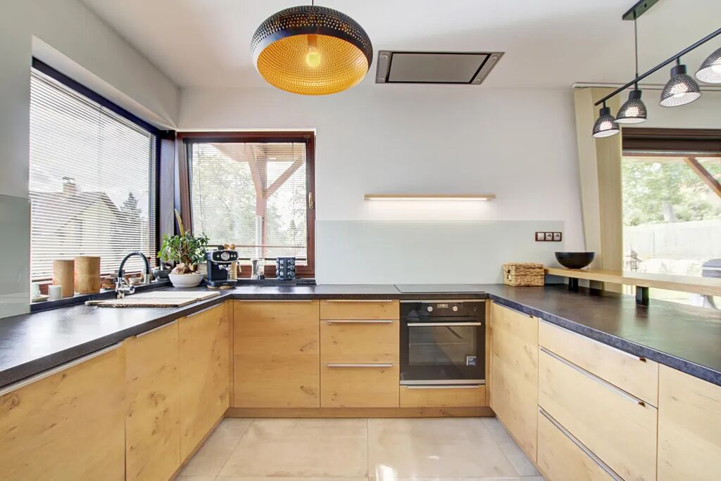 Dominantou domu je velký obývací pokoj s krbem na dřevo a širokými prosklenými dveřmi, které vedou na prostornou terasu (23 m2) a do zahrady. Součástí pokoje je špičková zakázková kuchyně z masivu ve tvaru U s jídelním pultem. Kuchyně je vybavena:
