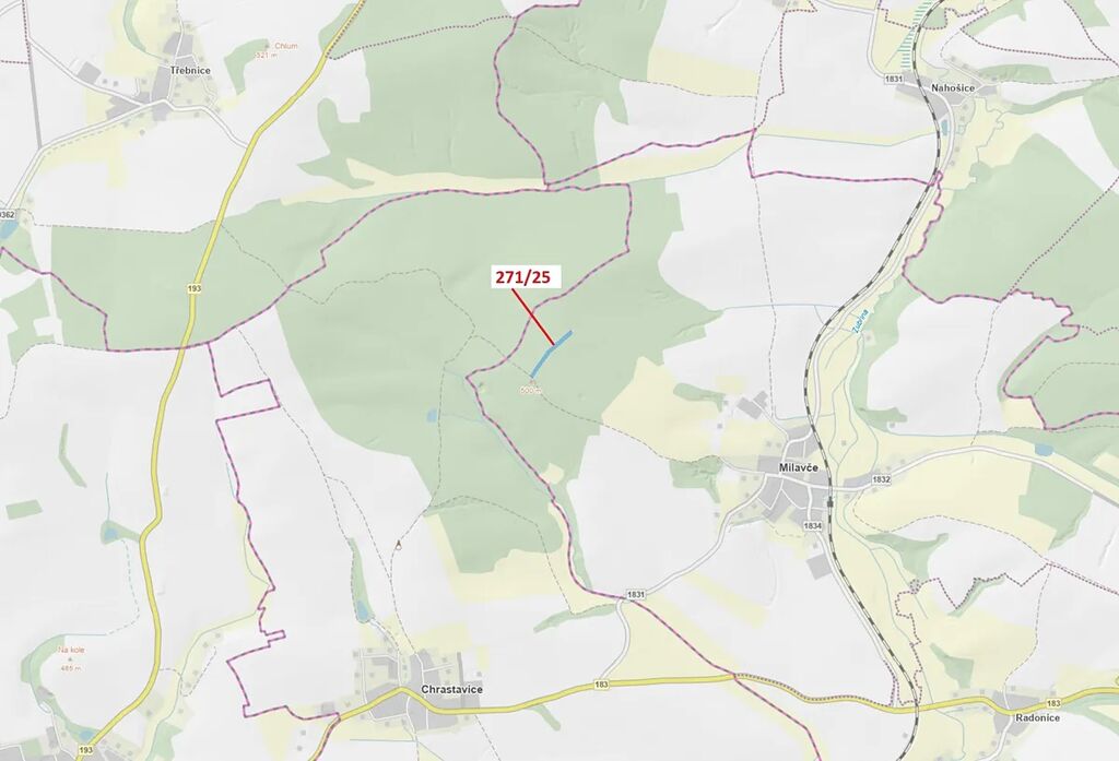 Lesní pozemek o výměře 5 905 m2, parcelní číslo 271/25, podíl 1/1, katastrální území Milavče, obec Milavče, obec s rozšířenou působností Domažlice, okres Domažlice, Plzeňský kraj. Po těžbě.