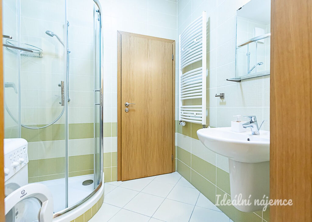 Kuchyňský kout je vybavený vestavnou lednicí s mrazákem, elektrickou troubou, varnou deskou, digestoří, mikrovlnnou troubou a dalšími malými domácími spotřebiči. Obývací část nabízí jídelní stůl s židlemi, dvě rozkládací sedačky, konferenční stolek, křeslo, lampu, vinotéku, televizi a police. Koupelna má sprchový kout, umyvadlo a pračku. Toaleta je samostatná. V předsíni je vestavěná skříň.