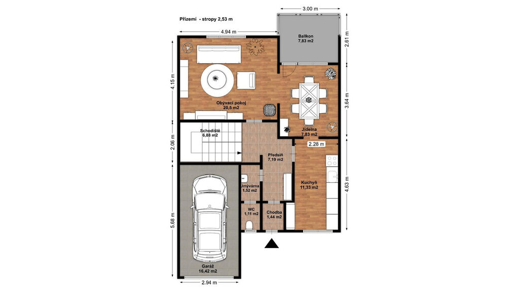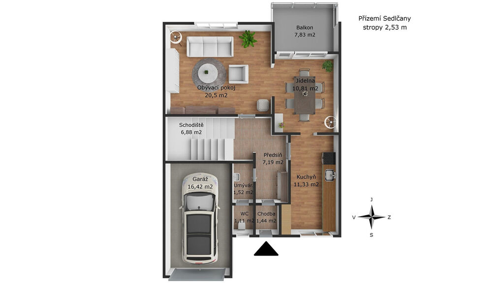 V přízemí najdete praktické 2+1 – kuchyni, obývací pokoj, další pokoj, koupelnu, prostor pro šatní skříně, balkon a garáž – celkem 85,06 m².