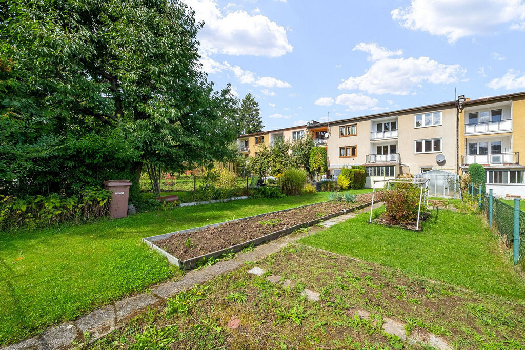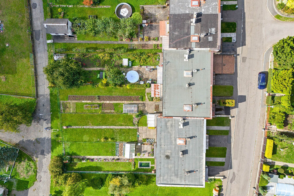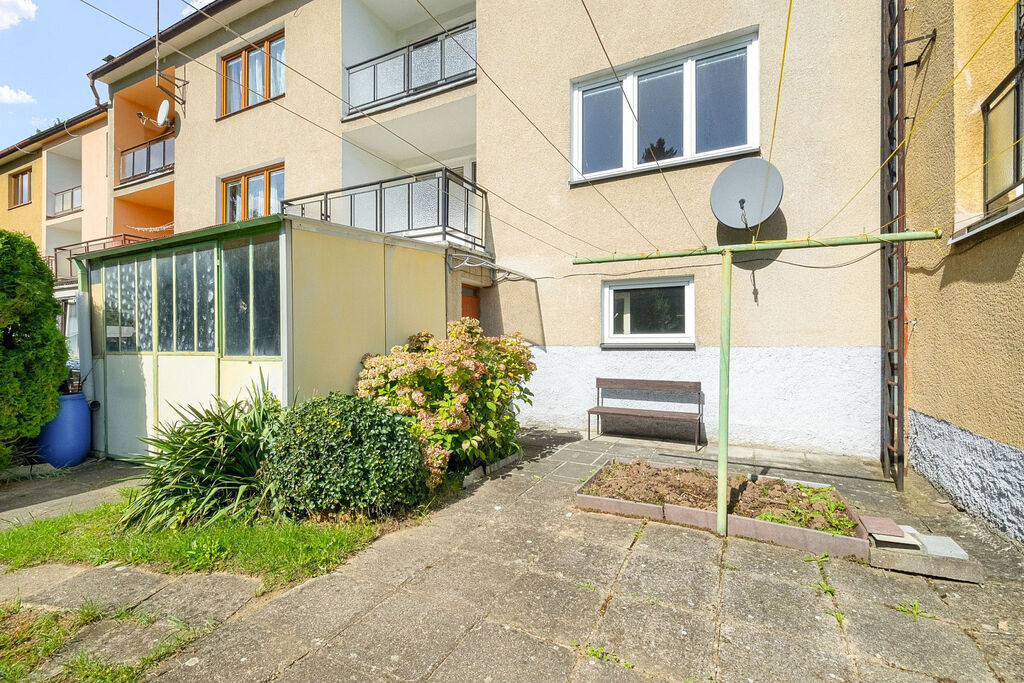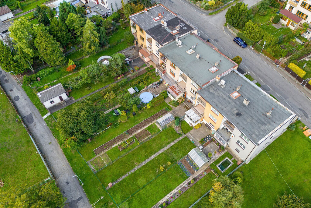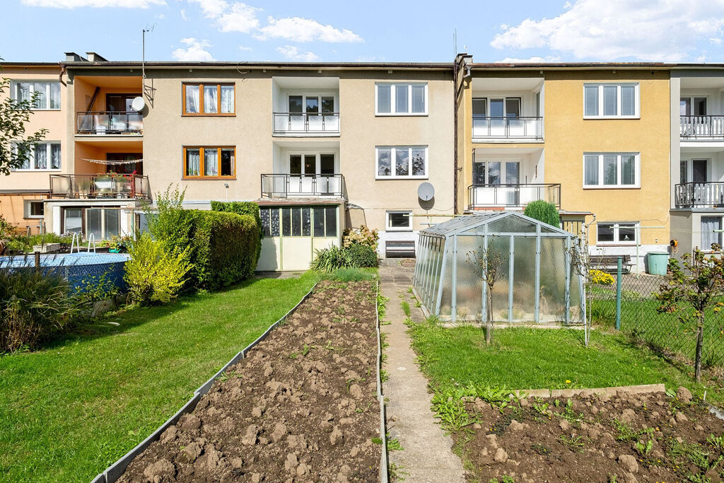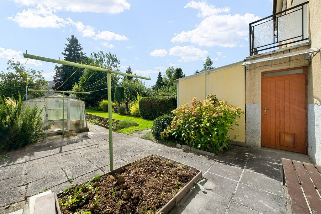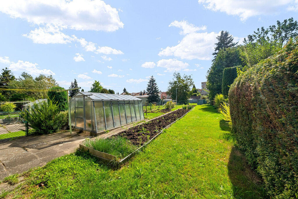 Za domem se rozkládá jižně orientovaná oplocená zahrada o 259 m², celý den zalitá sluncem. Najdete tu skleník, připravené záhonky a spoustu prostoru pro odpočinek, posezení nebo dětské hry. Na zahradu se dá pohodlně vstoupit přímo ze sklepa a je možné na ni vjet i autem z ulice.