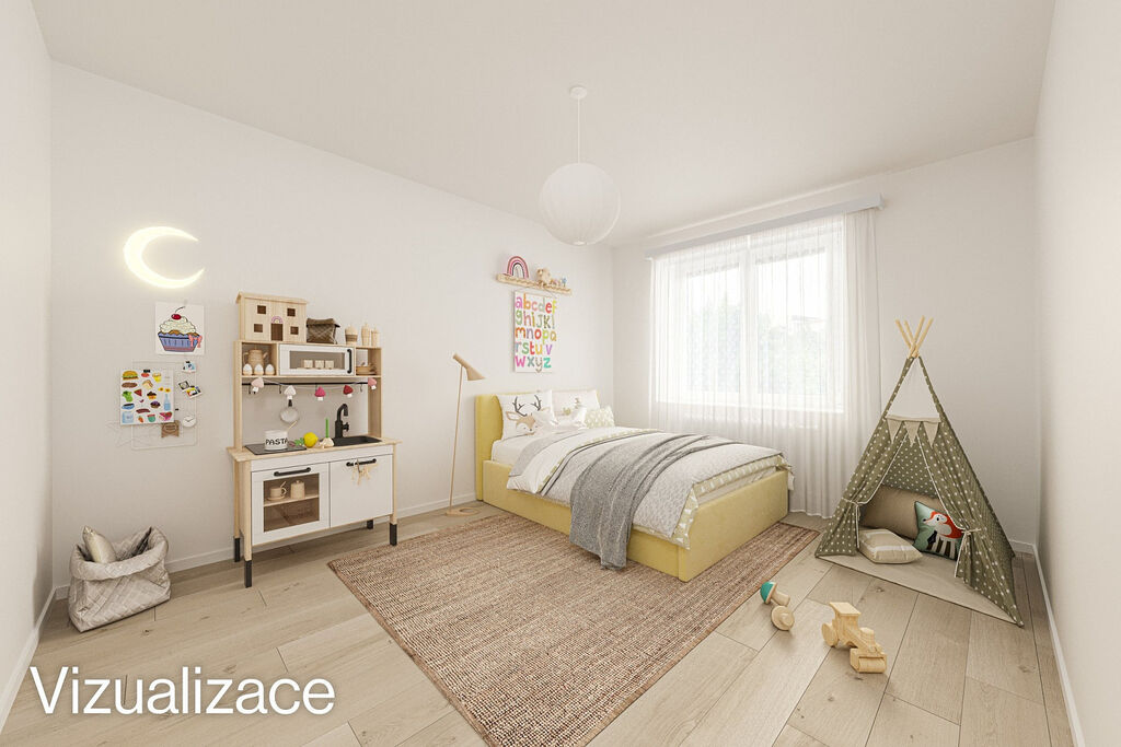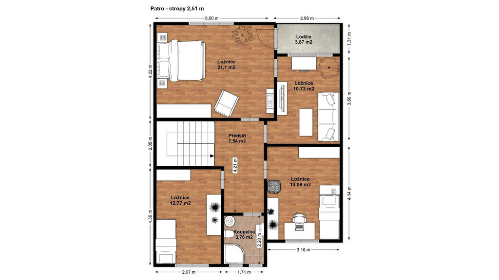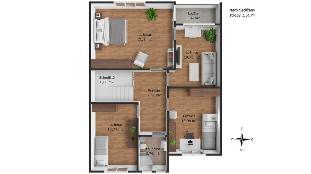 V patře jsou čtyři samostatné ložnice, každá s příjemným světlem, vlastní koupelna s WC a lodžie – celkem 76,06 m².