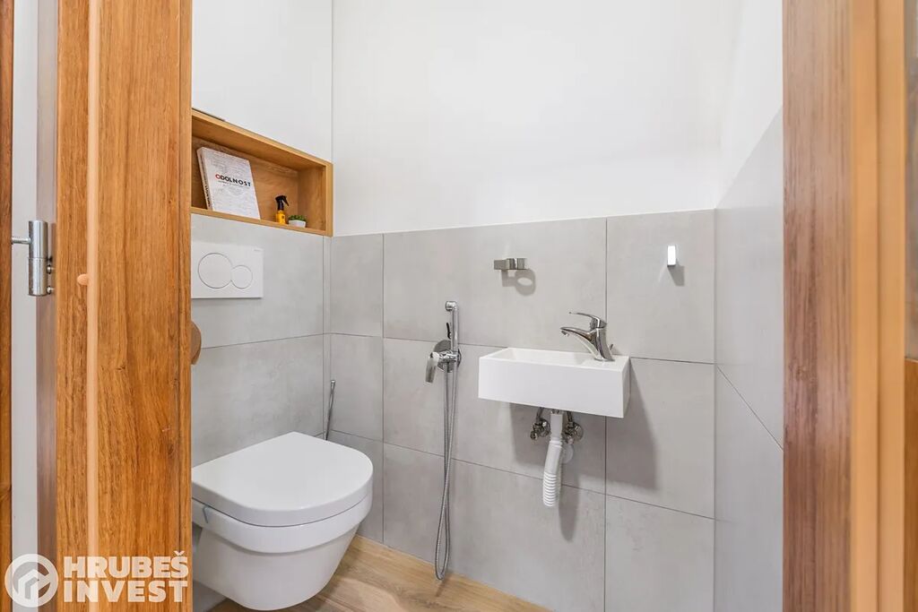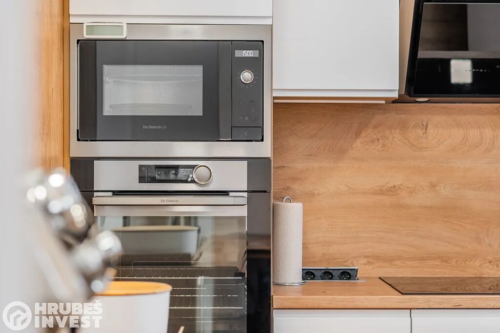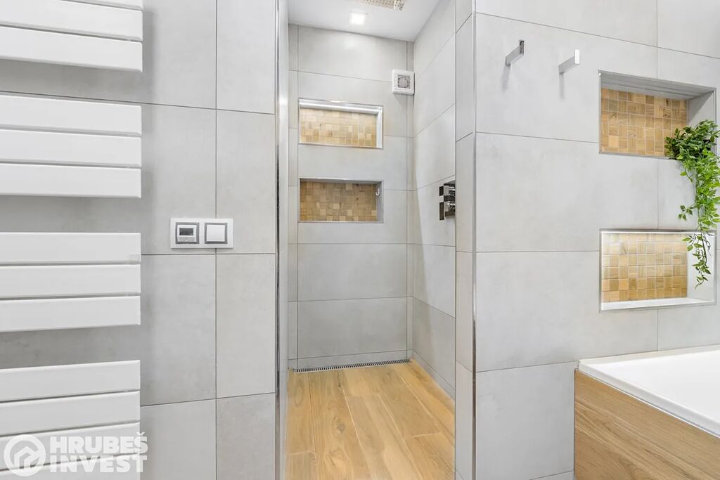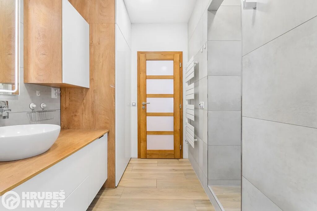 Byt o dispozici 3+kk se nachází v 5. nadzemním podlaží panelového domu s výtahem, který prošel kompletní rekonstrukcí v roce 2019. Tady je opravdu vše promyšlené do detailu – od vestavěných skříní, skryté komory až po elegantní koupelnu, kde najdete vanu i sprchový kout.