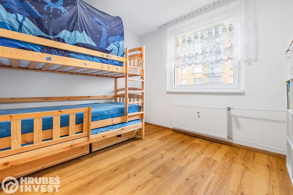 Ložnice má prakticky řešený pracovní kout, dětský pokoj působí útulně a chodba poskytuje množství úložného prostoru. Je zde kombinace vinylové podlahy a dlažby.