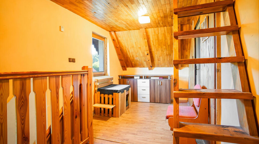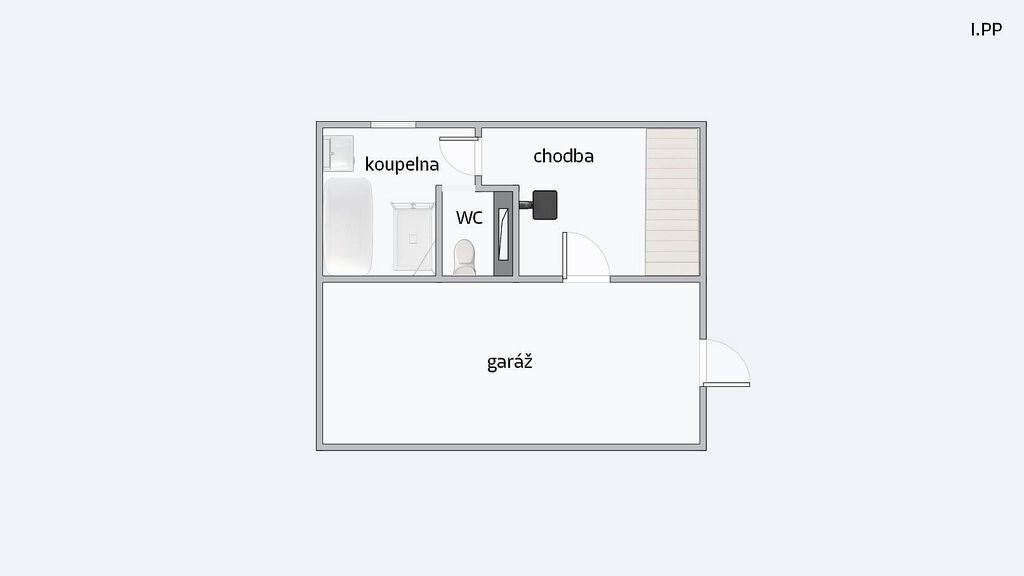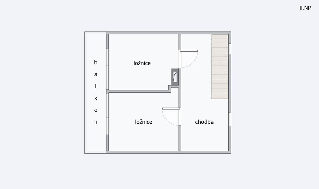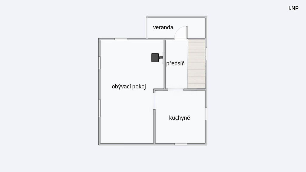 v 1. NP - hlavní vchod - se nachází vstupní chodba se schodištěm, kdy dále pokračujeme do prostorné kuchyně a obývacího pokoje s krbovými kamny a přímým vstupem pod krytou pergolu se zahradním posezením. Ze vstupní chodby se schodišti dostaneme do již zmíněného přízemí, nebo do podkroví, kde se nachází otevřený prostor se vstupy do dvou ložnic se společným balkónem.