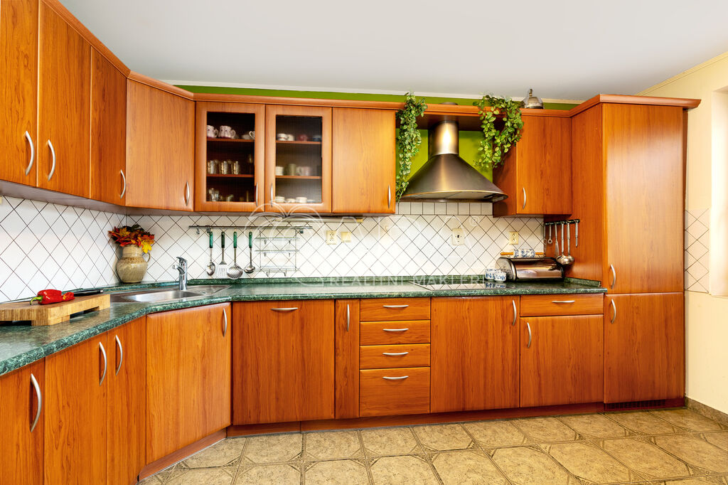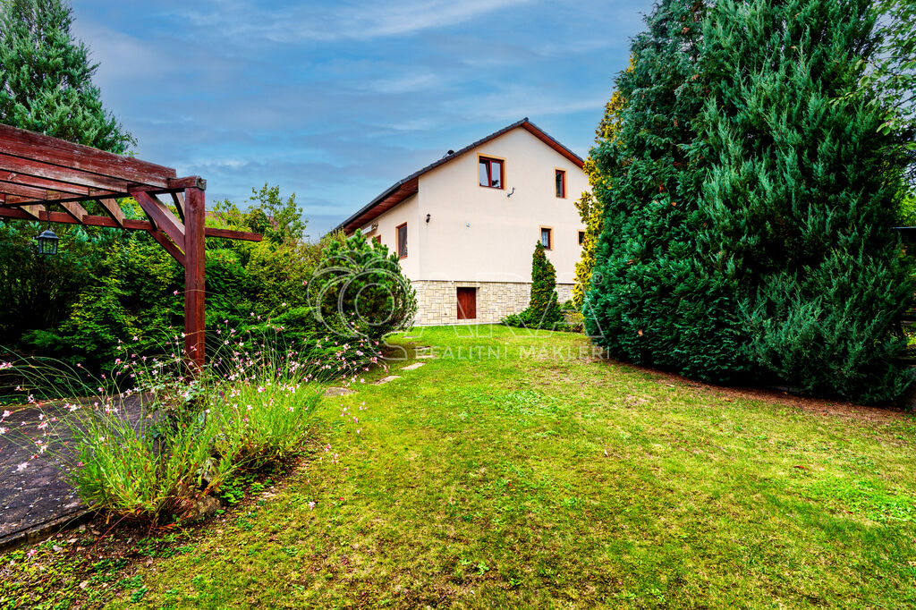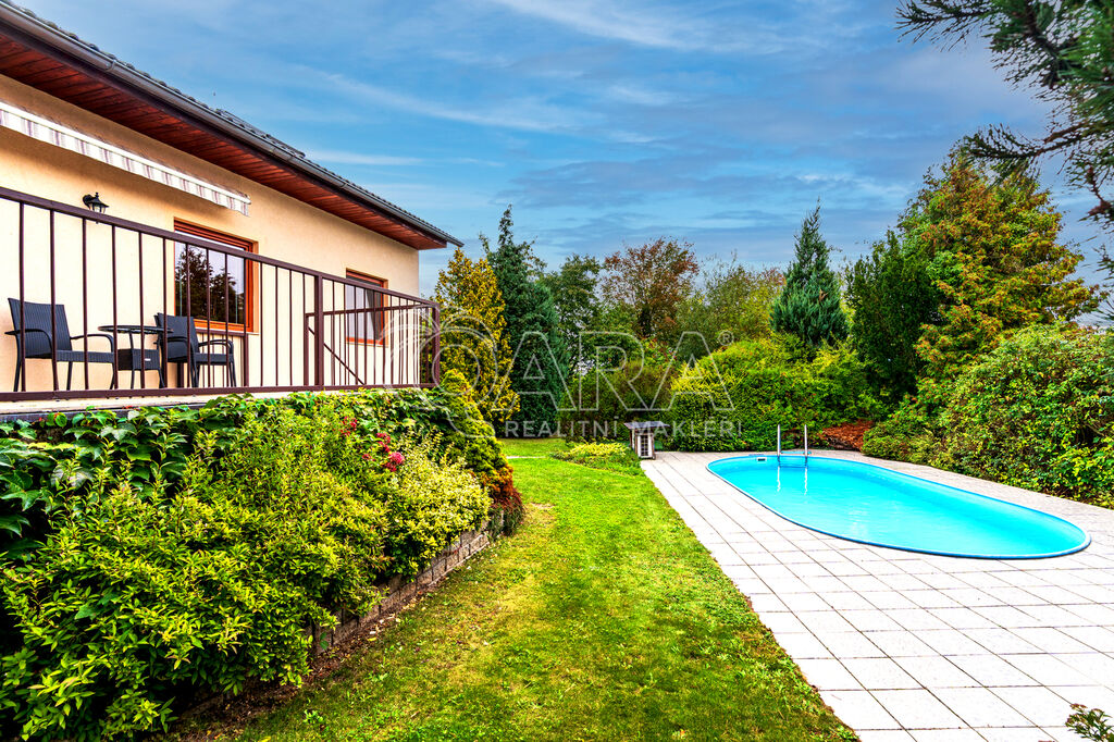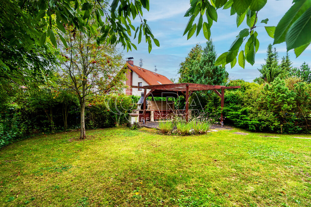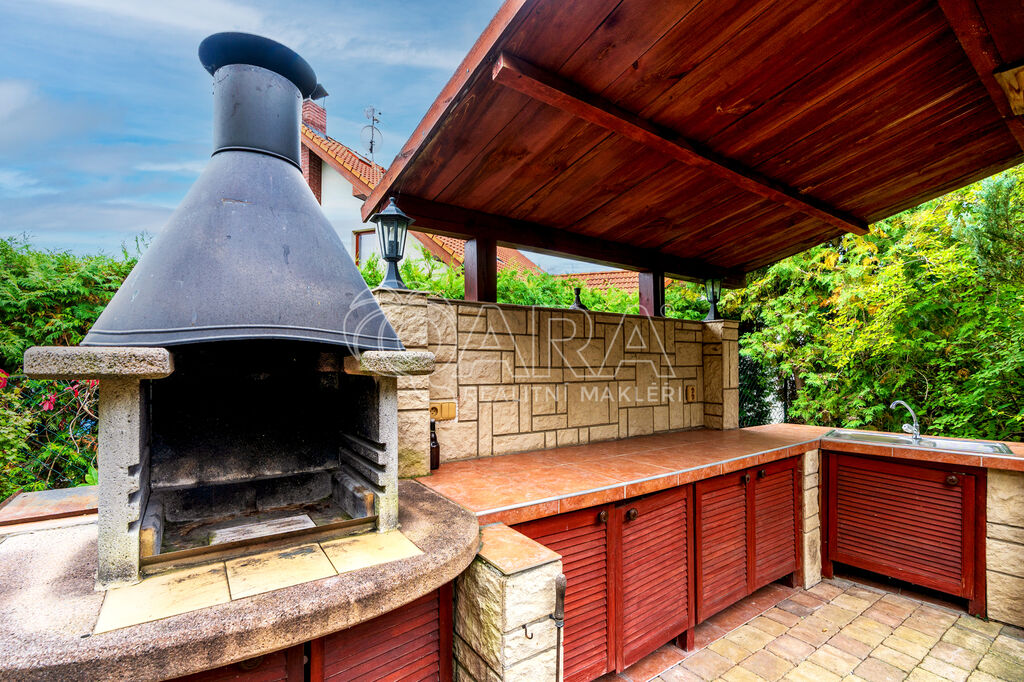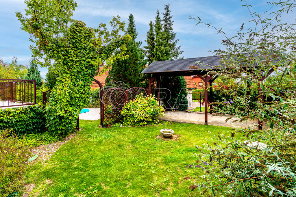 K relaxaci a osvěžení slouží zapuštěný bazén s pískovou filtrací, který je obklopen promyšlenou zahradou. Ta je navržena tak, abyste si v každou denní dobu mohli užívat jak stínu, tak sluníčka, a především soukromí, které poskytují okrasné dřeviny v kombinaci s ovocnými stromy a několika hlavami vinné révy. Zavlažování zahrady je zajištěno automatickým zavlažovacím systémem. Zahrada je doplněna krásnými dekoračními dřevěnými prvky a pergolou s venkovním grilem s letní kuchyní, která je vybavena dřezem a napojena na vodu, což oceníte při letních posezeních s rodinou a přáteli.