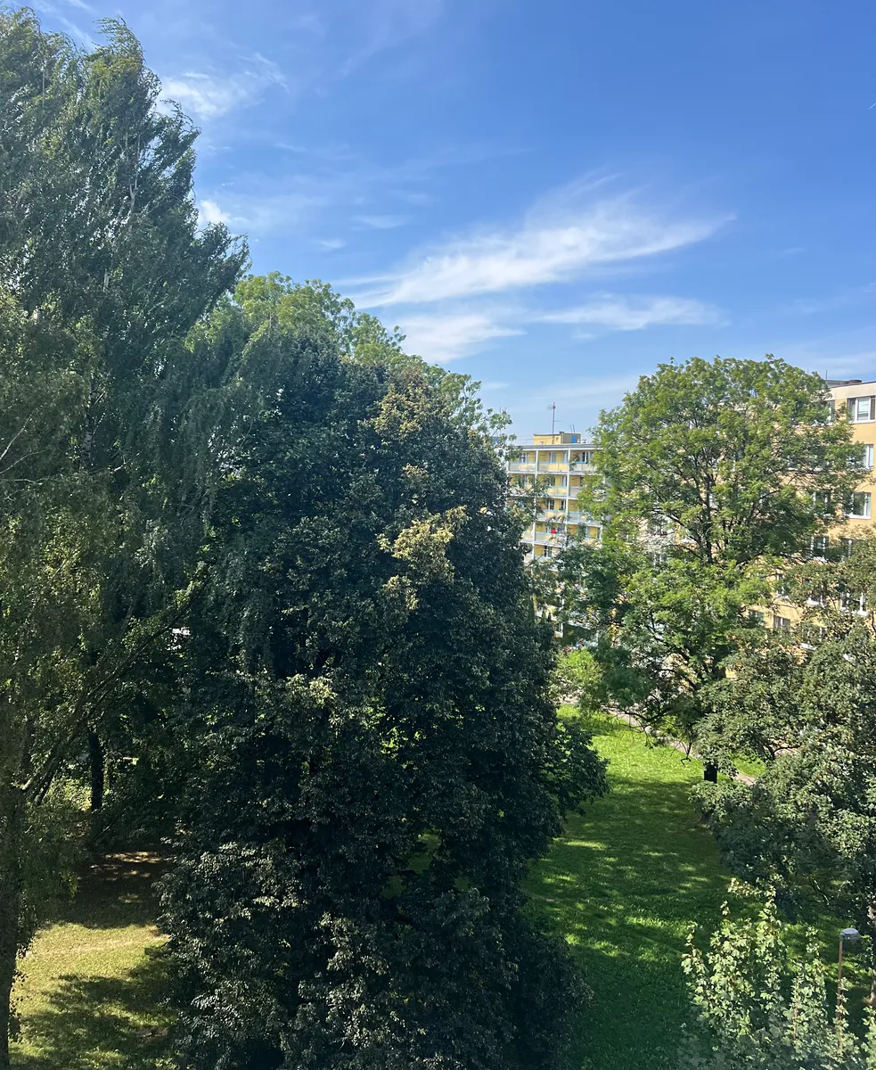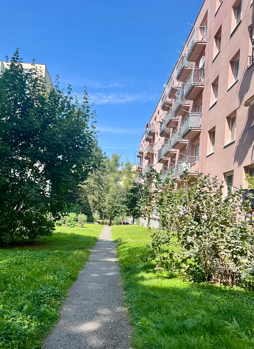 Byt se nachází v 5. patře zatepleného domu s plastovými okny. Na každém patře jsou pouze tři byty, což zajišťuje soukromí a klid. Balkón je orientován do tichého vnitrobloku se zelení a u domu jsou parkovací místa.