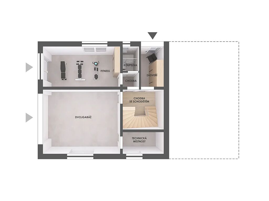 Důraz byl kladen na komfortní parkování, což je zajištěno prostornou garáží a další možností parkování na pozemku. Součástí vily je také sklep, který poskytuje dodatečný úložný prostor pro vytvoření fitness centra případně vytvoření bytu o velikosti 2+KK, nebo tento prostor lze využít pro interiérový bazén.