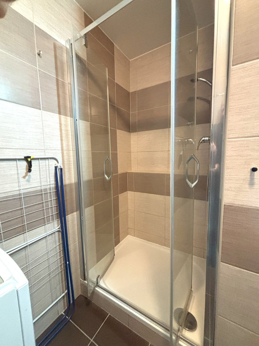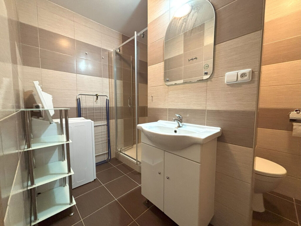V koupelně nalezneme sprchový kout s walk in systémem vstupu, umyvadlovou skříňku s umyvadlem a zrcadlem, skleněnou koupelnovou skříňku a pračku.