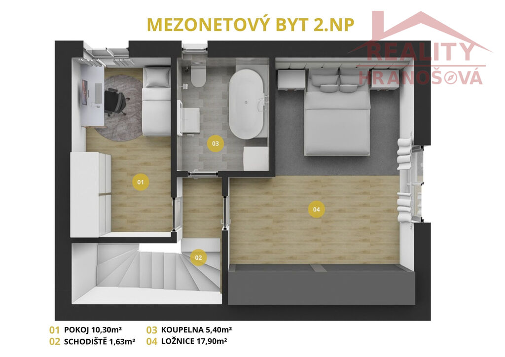 Nabízíme Vám ke koupi nízkoenergetickou novostavbu - moderně řešený mezonetový byt 3+kk o celkové výměře 81 m2, s terasou a se zahrádkou v klidné části obce Háj ve Slezsku. Bydlení je zajištěno v soukromé rezidenci, pro klid a bezpečí Vašeho nového bydlení.
