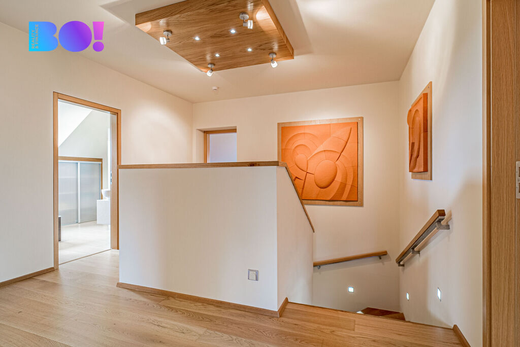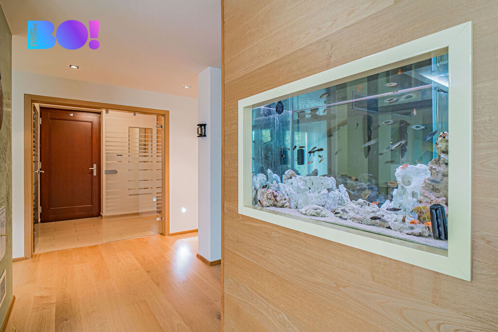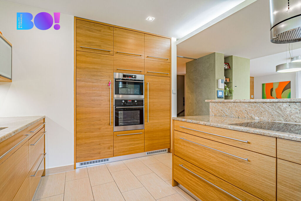Příjemnou atmosféru v domě tvoří jednotný koncept volby přírodních materiálů jako jsou dřevěné schody, podlahy či zárubně s dveřmi z masivu, kuchyňská linka včetně ostrůvku osazená žulovou deskou, krb na dřevo či netradičně zabudované akvárium ve stěně obývacího pokoje. Veškeré skříně jsou na míru a poskytují dostatek úložných prostor. Součástí prodeje jsou také umělecká díla na stěně v prostoru schodiště, jež byla speciálně navržena pro tento prostor.
