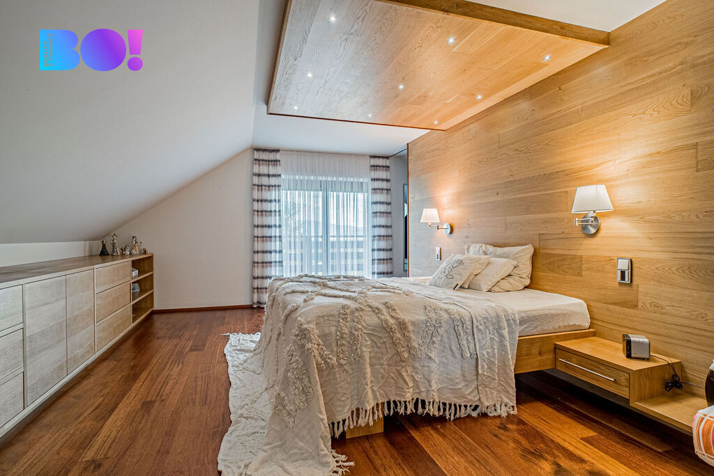 Přestože dům z cesty nevypadá příliš velký, opak je pravdou. Architekt zde odvedl perfektní práci a skvěle zabudoval dům do svažitého terénu takže i spodní patro je plnohodnotné. Najdete zde 5 pokojů (ložnice a 3 samostatné pokoje v 2.NP, 1 pokoj v 1.NP), 2 koupelny, obývací prostor spojený s kuchyní s výstupem na krytou terasu, dále pak pracovnu v suterénu, saunu, technickou místnost a drobné prostory pro úklid či spíž.
