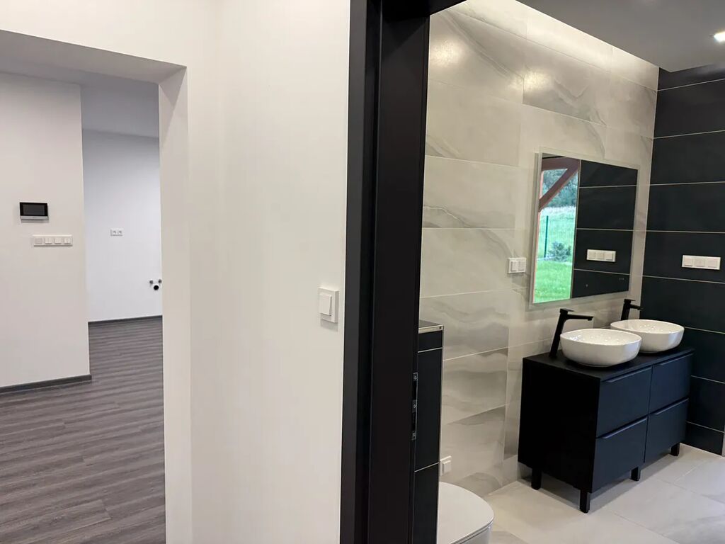 V domě se dále nachází technická místnost, šatna, stylově zařízená koupelna s vanou i sprchovacím koutem se vstupem na terasu. V celém domě vinylové podlahy, dlažby.