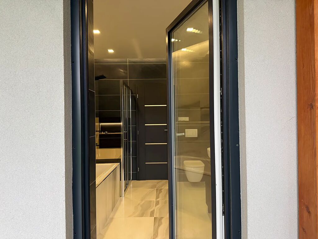 Okna – plastová,barva antracit-trojsklo, venkovní žaluzie , vstupní dveře - plastová , barva antracit.