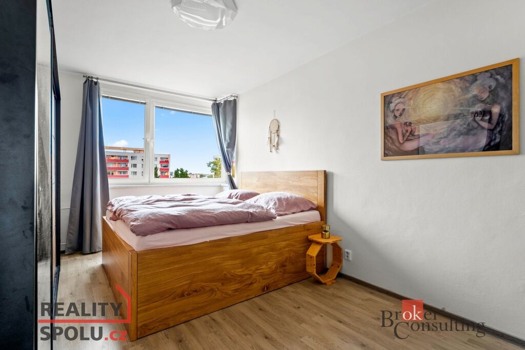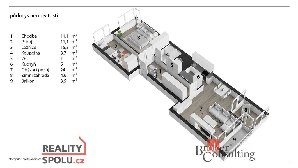 Dispozice: prostorná chodba, samostatná ložnice (15,3 m²), další pokoj (11,1 m²), obývací pokoj (24 m²) s jídelní částí, kuchyň (5 m²), koupelna se sprchovým koutem (3,7 m²), samostatné WC (1,0 m²). K bytu náleží balkon (3,5 m²) a zimní zahrada (4,6 m²).