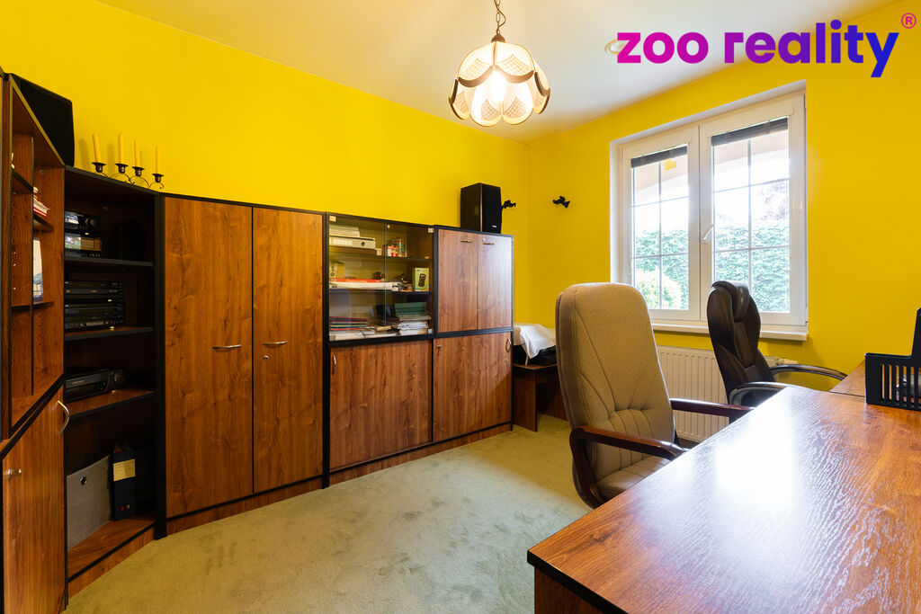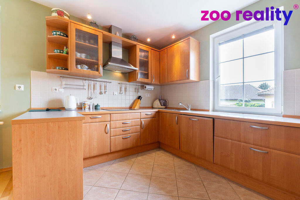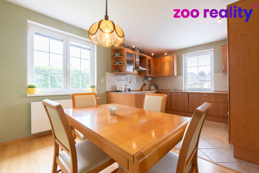 Dům má velmi dobře promyšlenou dispozici 4+kk. Obytný prostor tvoří světlý a vzdušný obývací pokoj s krbem, navazující jídelní kout a kuchyň s oknem do zahrady. Z obývací části je přímý vstup na krytou terasu s výhledem do zeleně. Dále jsou k dispozici dvě ložnice, pracovna, koupelna s vanou a sprchovým koutem a samostatná toaleta. Vstupní hala je vybavena vestavěnými skříněmi. Součástí domu je rovněž garáž a menší dílna.
