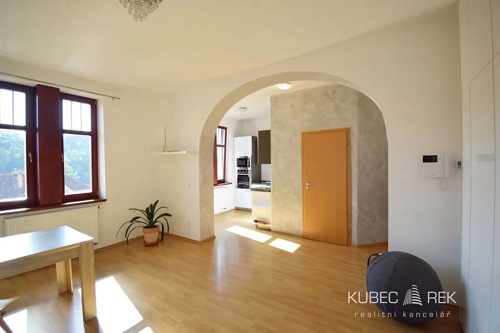 Byt zaujme příjemně oddělenou dispozicí – kuchyň s předsíní jsou částečně oddělené od světlého obytného prostoru, což vytváří pocit většího soukromí a pohodlí. Kuchyňská linka je plně vybavena moderními vestavnými spotřebiči: myčka, trouba, mikrovlnka, sklokeramická deska, digestoř i lednice. V koupelně je připraven prostor na pračku, dostatek úložných možností pak nabízejí vestavěné skříně v předsíni i obytné části. Další vybavení lze dohodnout.
