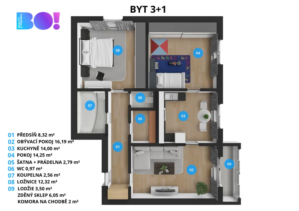 Dispozice 3+1 s podlahovou plochou 71,4 m² umožňuje opravdu pohodlné bydlení. Praktická je navíc i samostatná místnost na pračku a domácí prostředky. K tomu je možné v obývacím pokoji využít zasklený balkon o velikosti 3,5 m².