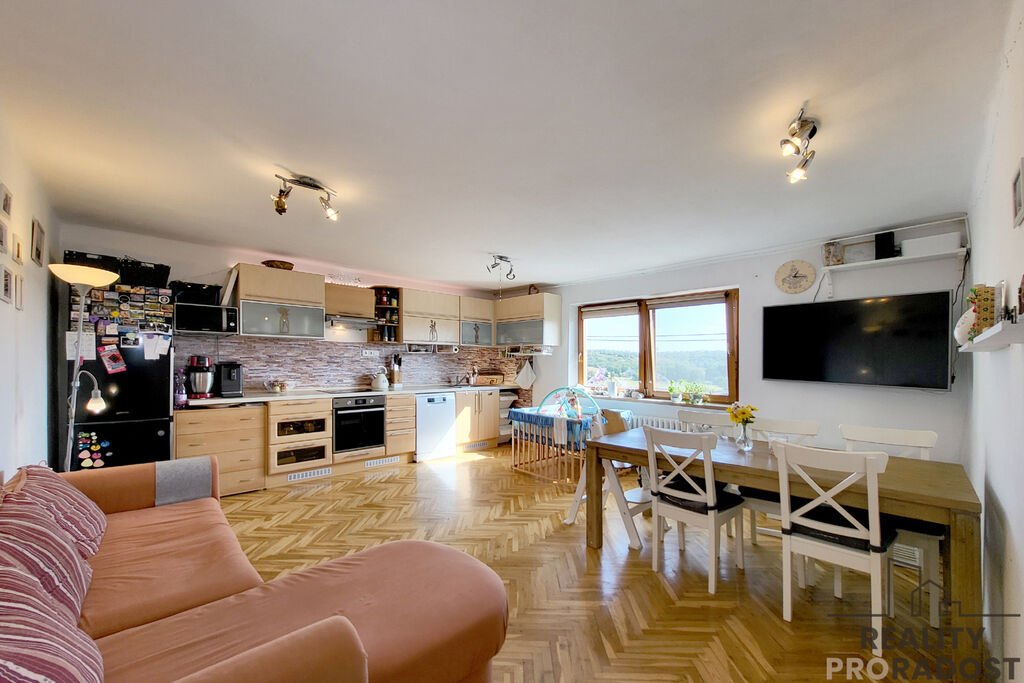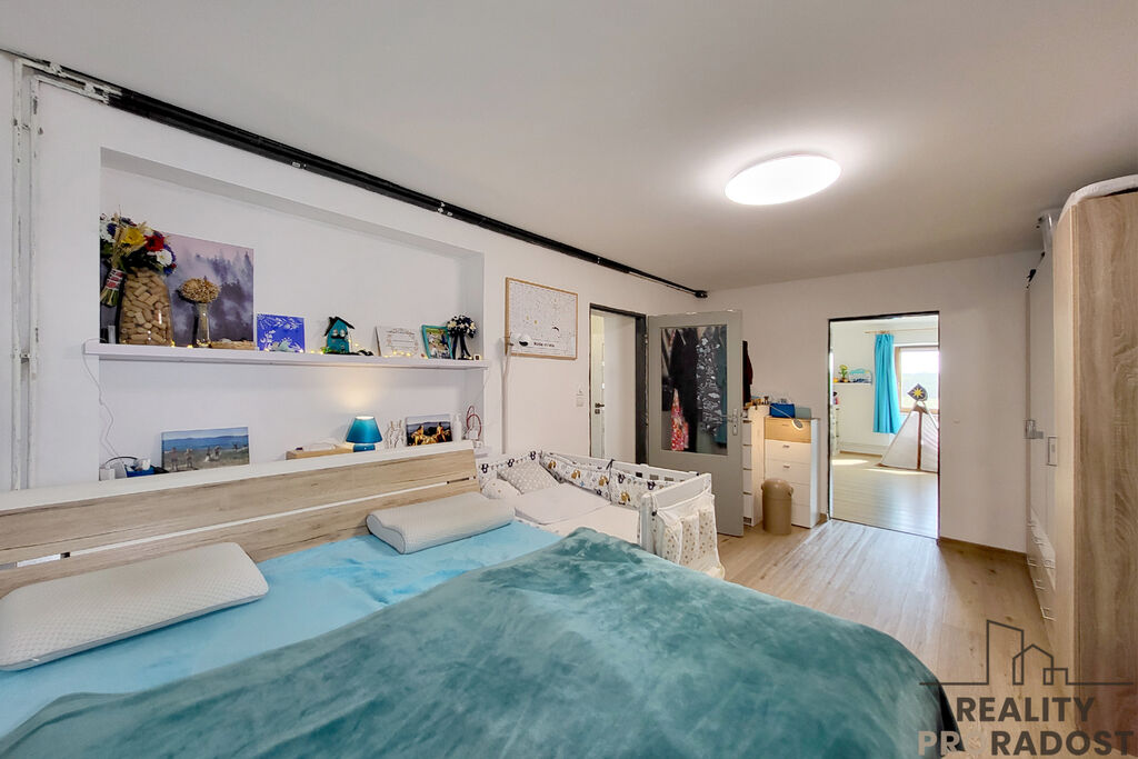 Srdcem domu je světlá kuchyně propojená s jídelnou a obývacím prostorem. Na obytnou část navazuje pokoj využívaný jako dětský, dále pracovna a ložnice, která prošla kompletní rekonstrukcí v letošním roce. Prostorná koupelna s vanou a WC.