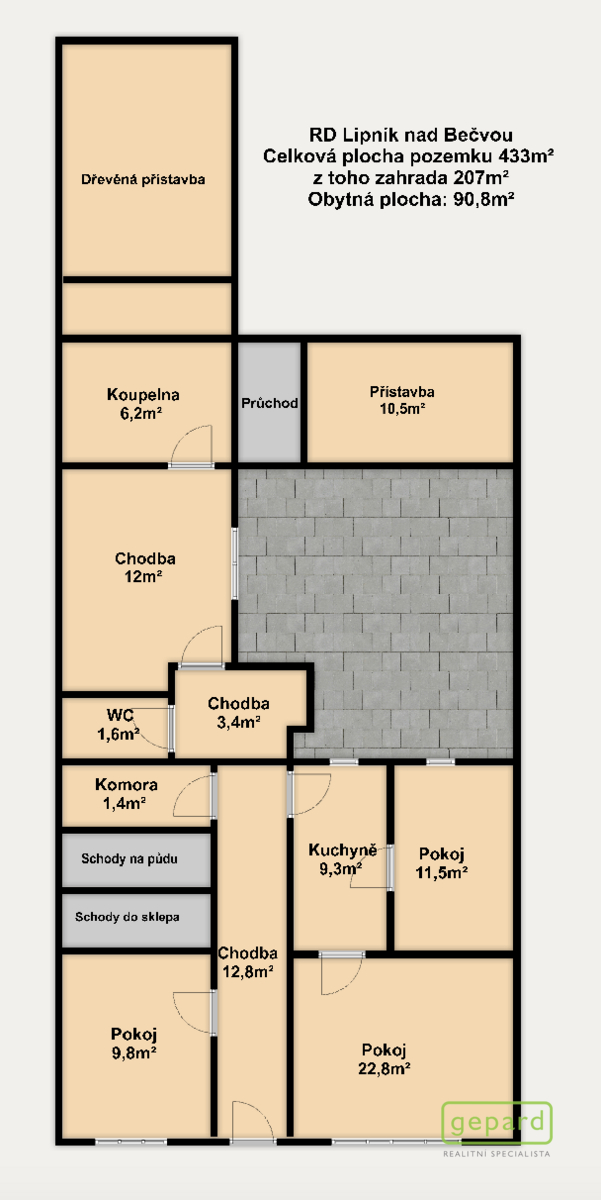 Celková plocha pozemku činí 433 m², z toho 227 m² tvoří zastavěná plocha a nádvoří a 206 m² zahrada. Obytná plocha domu je 90,8 m² a současná dispozice zahrnuje tři neprůchozí pokoje, kuchyni, koupelnu, samostatné WC, chodbu, komoru a sklep. Podkroví, které je aktuálně nevyužívané, poskytuje prostor pro budoucí rozšíření – je možné zde vybudovat další pokoje.