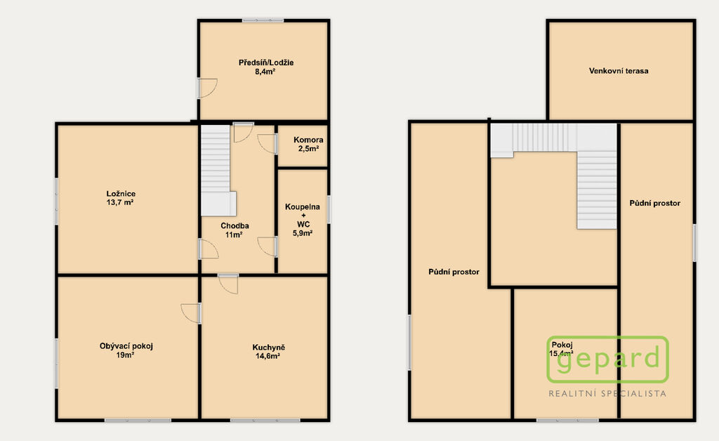 První patro: jeden prostorný pokoj a dva pokoje - půdní prostory, které jsou aktuálně využívané k uskladnění věcí. Po rekonstrukci lze v patře vybudovat až tři plnohodnotné pokoje.