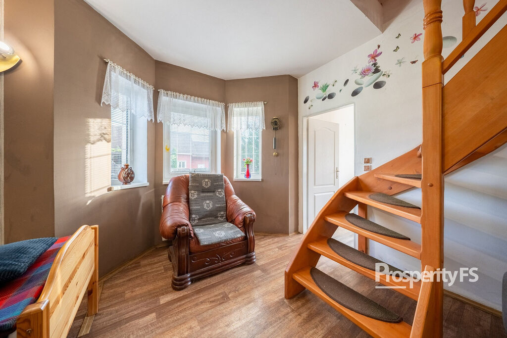 V patře jsou tři ložnice, koupelna s vanou a praktická komora. Nad obytnou částí je půda, kterou lze využít jako úložný prostor.