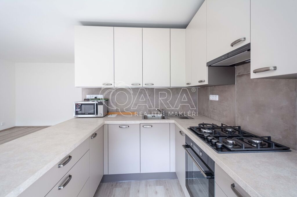 Kuchyňská linka včetně spotřebičů: plynová deska, digestoř, el. trouba, myčka. Hledáme dlouhodobé nájemníky, vhodné pro rodinu (nekuřáky, bez exekucí).