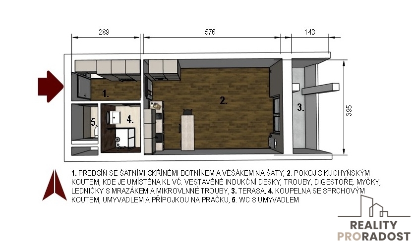 Nabízíme k pronájmu částečně zařízenou novostavbu bytu 1+kk s terasou v polyfunkčním komplexu Allrisk MERIDIEM v Brně Komárově na ul. Komárovská, který je součástí nově vznikající městské čtvrti Trnitá.