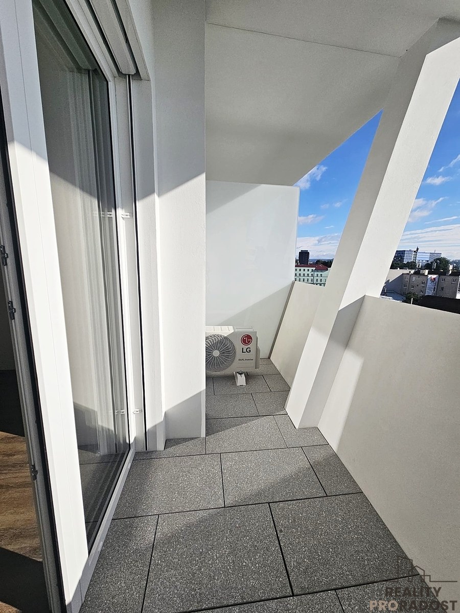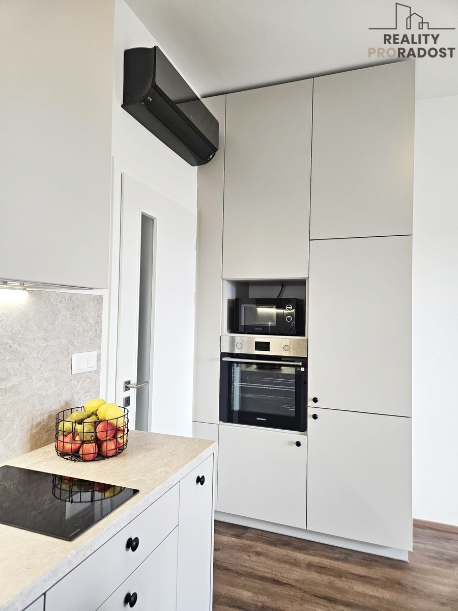 Nová bytová jednotka o celkové výměře 40,1 m2 vč. terasy (5,6 m2) se nachází ve 4.p./6. budovy s výtahem, je orientovaná na východ a nabízí komfortní bydlení s výhodou prvního nájemce v moderní budově s nevšední fasádou. Je částečně zařízená nábytkem na míru, vestavěnými spotřebiči, klimatizací a předokenními roletami. Prostornost a světlost bytu dokresluje výška stropu 3 m, která je plně využitá u veškerého vestavěného nábytku.