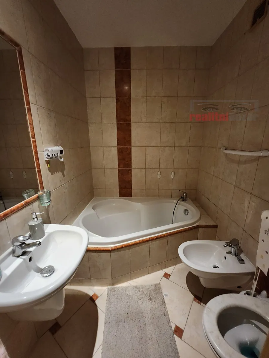 Hygienické zázemí: koupelna s vanou, umyvadlem, WC a bidetem. Byt má ještě 1 samostatné WC.