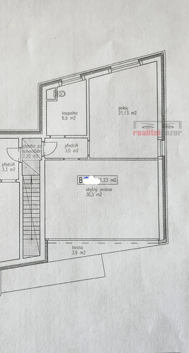 Dispozice: předsíň 3 m2, ložnice 21 m2, ob. pokoj 30 m2 s kuchyní