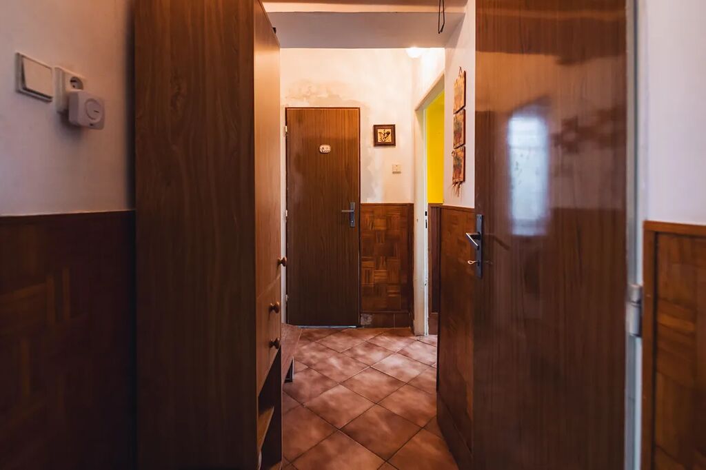 Interiér o dispozici 3+1 je rozložen mezi 2 podlažími, kdy hlavní vstup navazuje přes předsíň na spojovací chodbu, ze které se dostaneme do koupelny, samostatné toalety, komory, do sklepa a do obývacího pokoje s krbem nebo do samostatné kuchyně. Schodištěm se dostaneme do druhého podlaží, kde jsou dva samostatné neprůchozí pokoje a vstup na výše zmiňovanou terasu. V rámci rekonstrukce je možné uvažovat o přesunutí hlavního vchodu, předsíň zvětšit o komoru a získat tak minimálně jeden pokoj navíc, případně zvážit přístavbu.