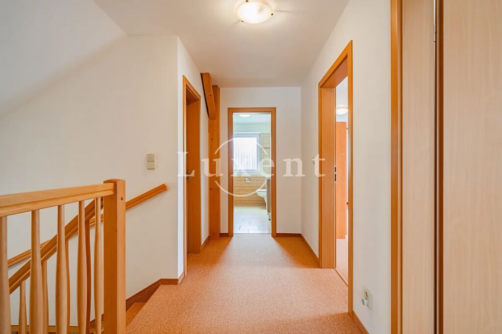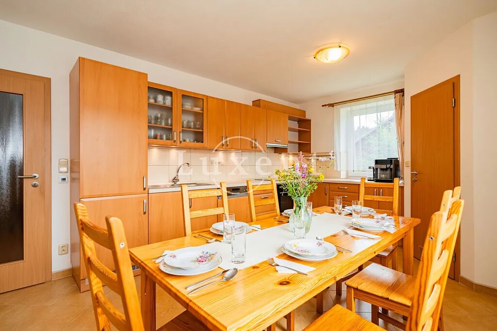 Dvoupodlažní objekt (dispozice 5+1) nabízí podlahovou plochu 151 m², garáž 32 m² a půdní úložný prostor 20 m². Dispozice umožňuje pohodlné rozdělení na soukromé i společné zóny, ideální pro ubytování menších skupin, firemních týmů nebo hostů. V přízemí se nachází zádveří, hala, plně vybavená kuchyně s jídelním koutem, světlý obývací prostor s krbovými kachlovými kamny, samostatná místnost vhodná např. jako kancelář nebo zázemí pro personál a toaleta. Podkroví nabízí tři ložnice, šatnu/komoru a moderní koupelnu s vanou, sprchovým koutem, umyvadlem a toaletou.