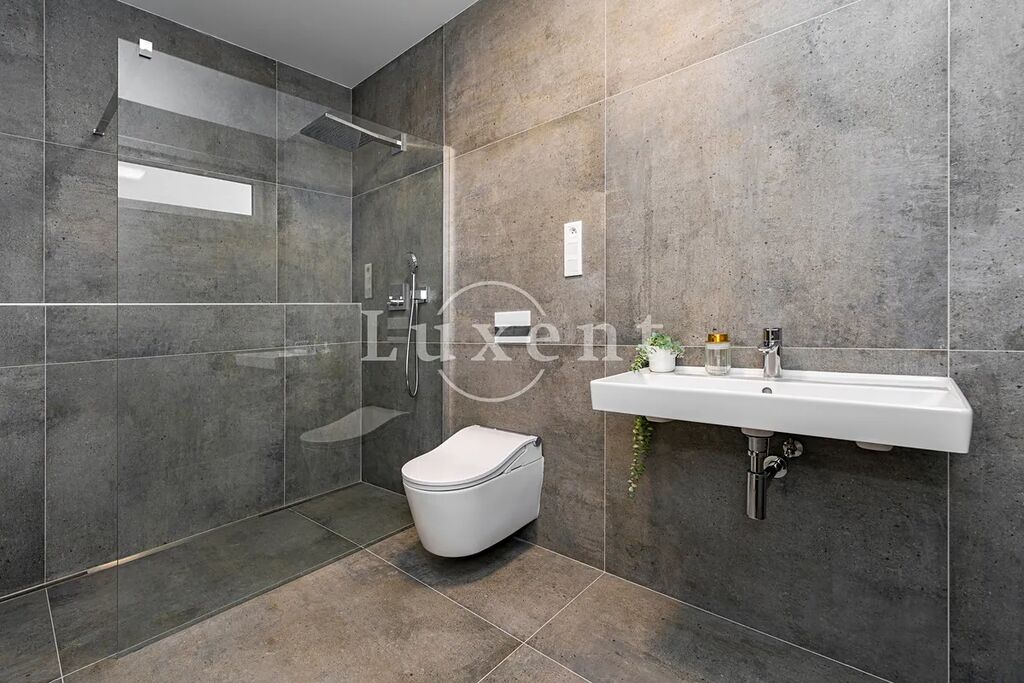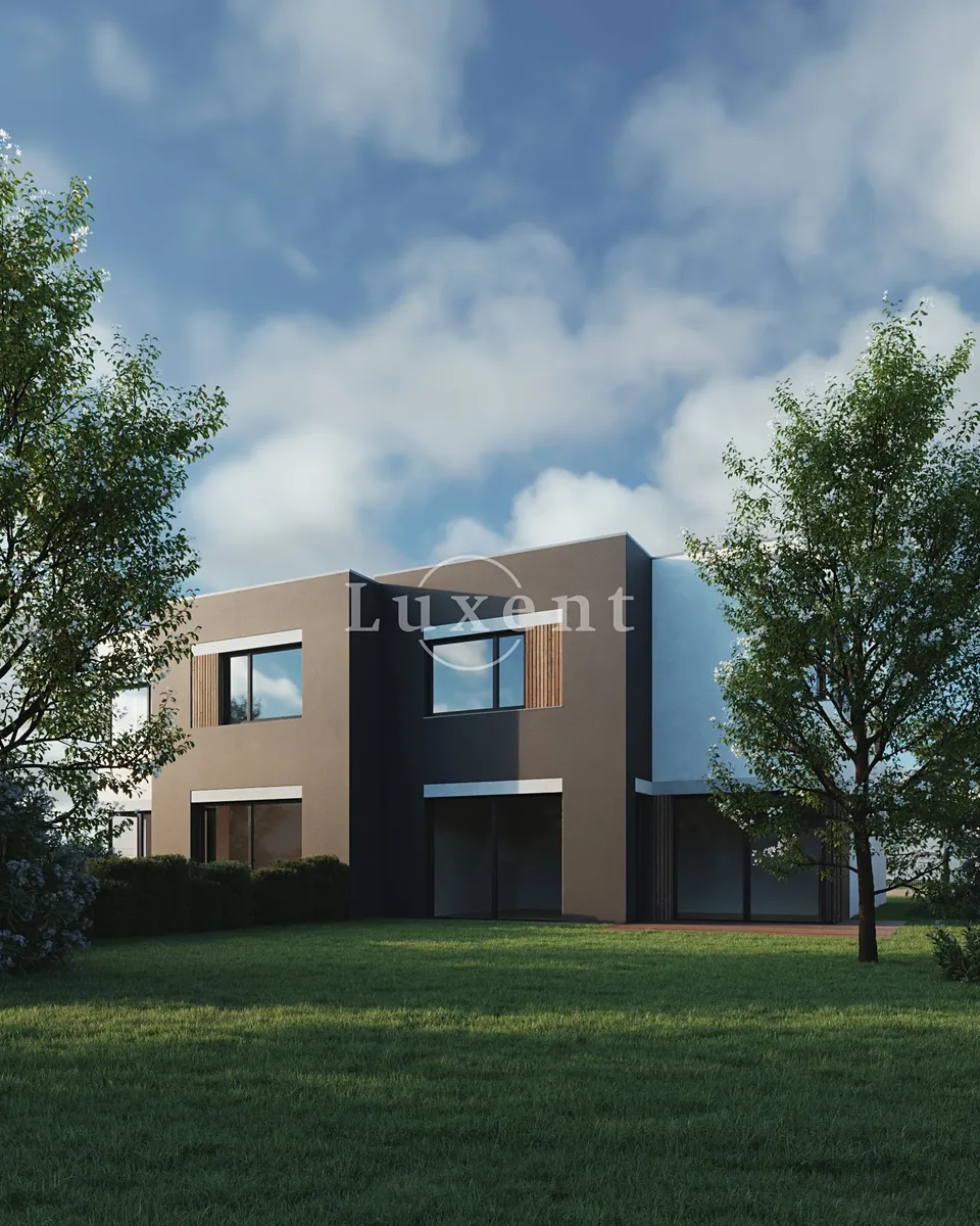 V přízemí domu se nachází předsíň, koupelna, prádelna, tech. místnost a velký obývací pokoj s kuchyňským koutem (42 m2) masivně prosklený do zahrady s terasou. V přízemí domu je také integrovaná garáž. V patře je pak hlavní ložnice s vlastní koupelnou a šatnou, dva pokoje s druhou koupelnou a prostorná úložná komora. Chodba nad schodištěm je prosvětlena světlíkem. Více viz přiložené půdorysy. Na podlahách je kvalitní laminátová plovoucí podlaha (dekor dle domu) a keramická dlažba. Vybavení koupelen: Villeroy & Boch.