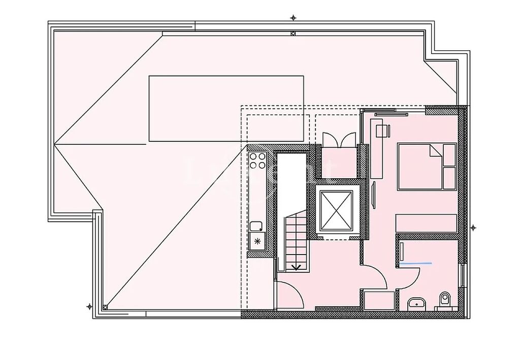 Byt má západní orientaci a zabírá první patro a podkroví budovy. K dispozici jsou také garážová parkovací stání v suterénu domu. Apartmán je vybaven moderními technologiemi a stylovým interiérem. Budova disponuje vlastním bazénem a sluneční terasou. Byt je vybaven klimatizací a podlahovým vytápěním, což zajišťuje komfortní pobyt po celý rok. Cena apartmánu nezahrnuje garážové stání.