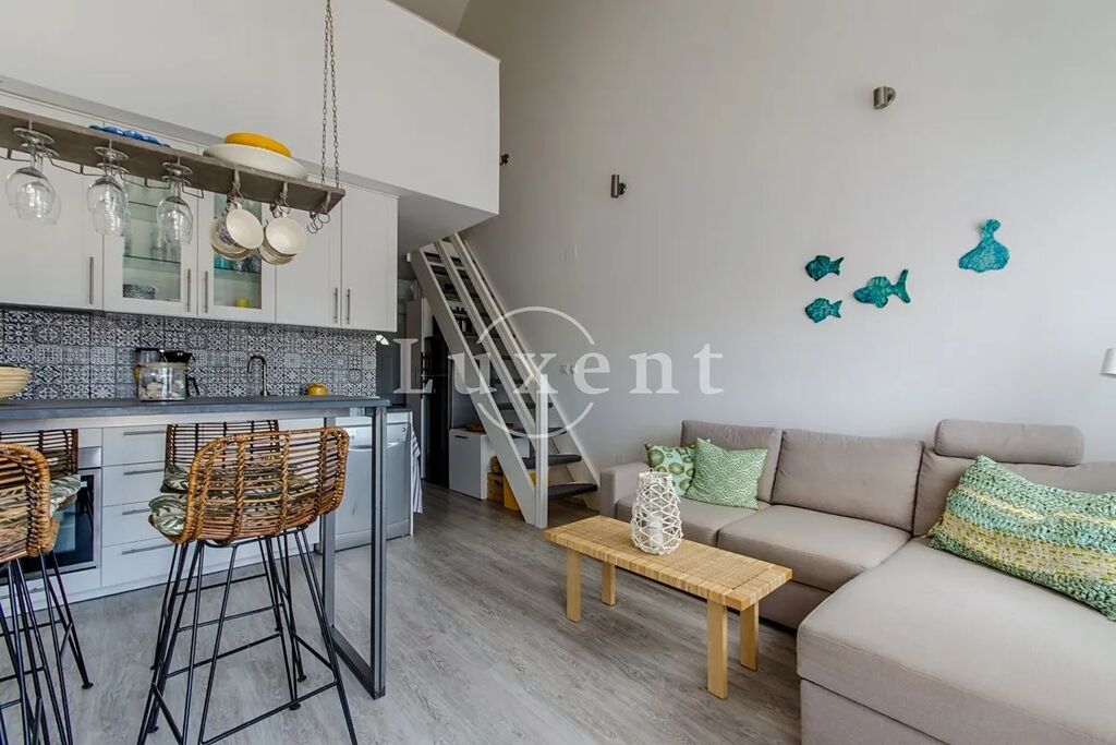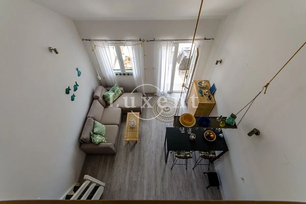 Tento útulný dvoupodlažní apartmán o celkové ploše 64 m2 se nachází jen 10 metrů od moře a nabízí ničím nerušený výhled na záliv a historické centrum města. Spodní podlaží tvoří obývací pokoj s kuchyňským a jídelním koutem, odkud je vstup na prostorný balkon o velikosti 10,7 m2 s otevřeným výhledem na moře. Dále se zde nachází jedna ložnice a koupelna. V horním patře je umístěna druhá ložnice v otevřené galerii.